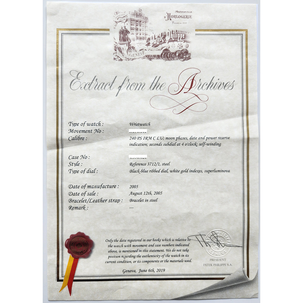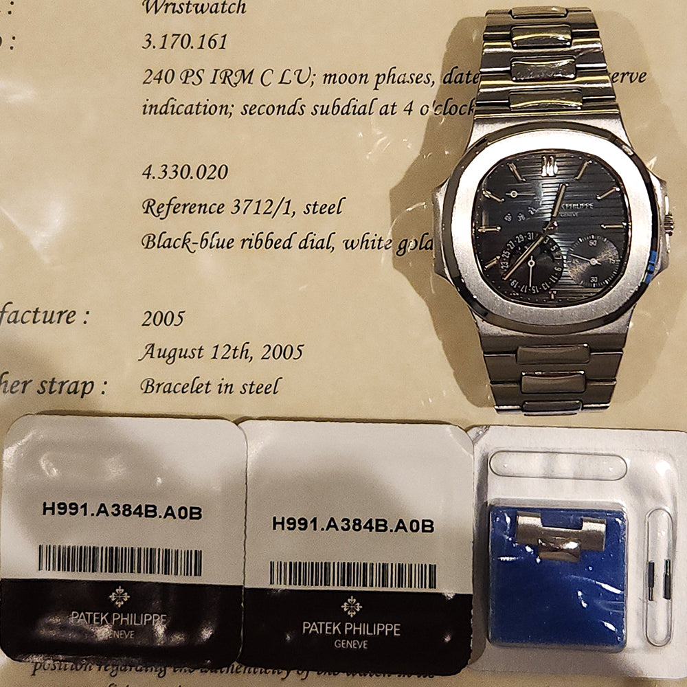 2005 Patek Philippe Nautilus Moon Phase Stainless Steel 3712/1A-001 38mm watch with 2019 Archive Papers