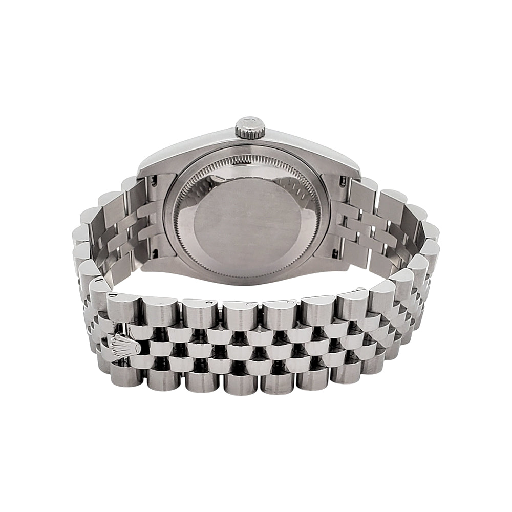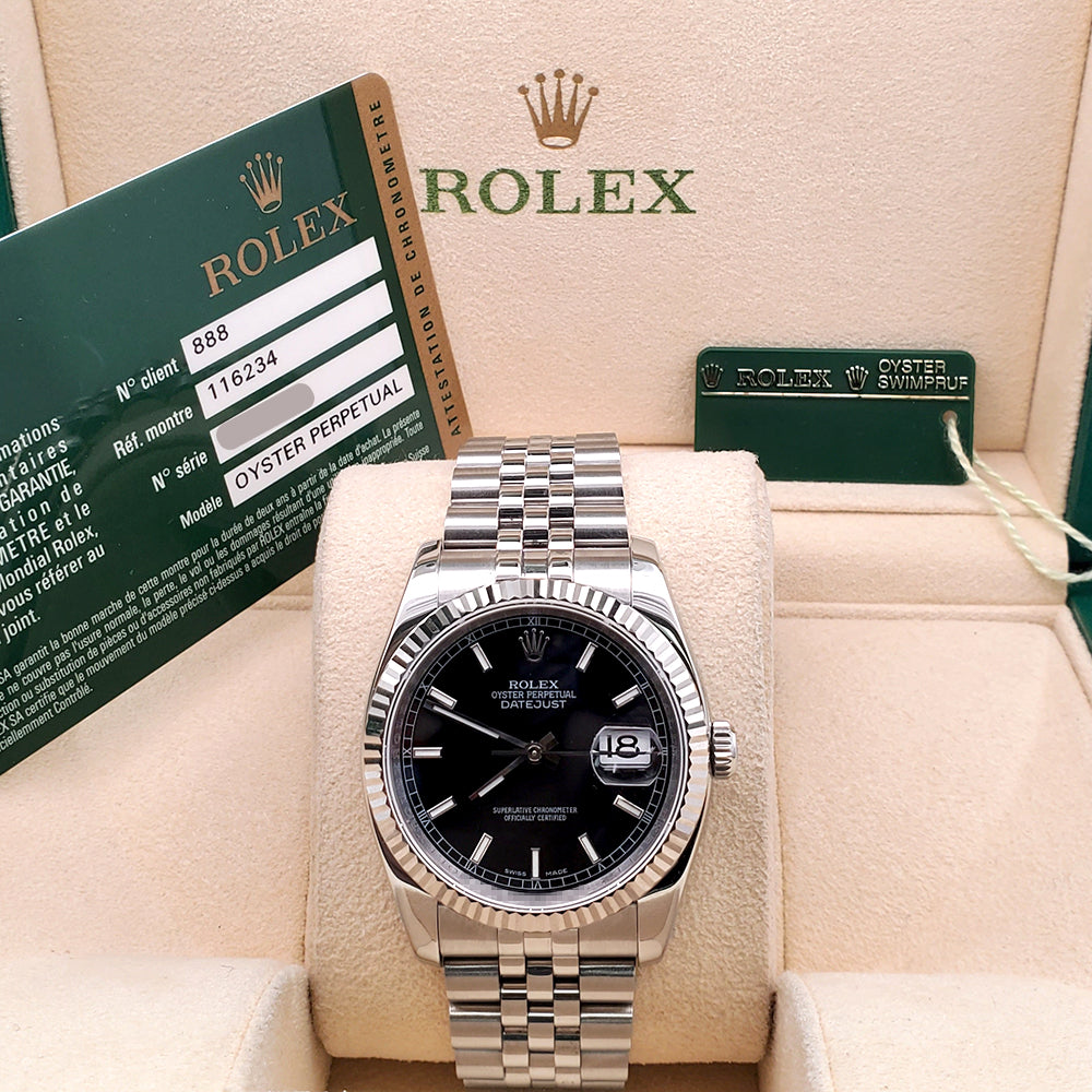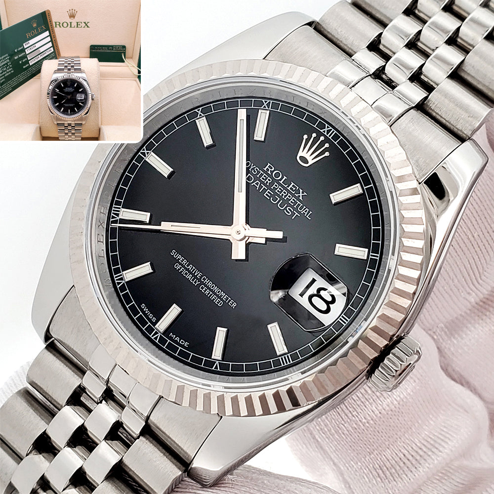 2009 Rolex Datejust Black Index Dial White Gold Fluted Bezel Steel Jubilee 36mm Watch 116234 Box/Papers/Tag