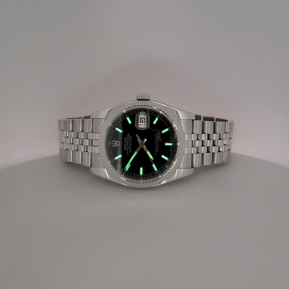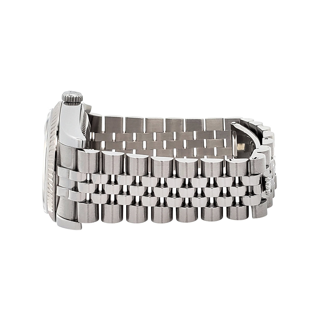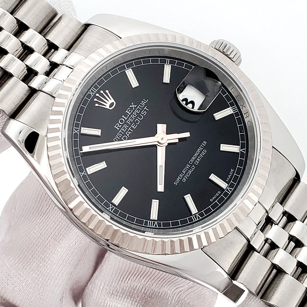 Rolex Datejust 36mm Black Index Dial White Gold Fluted Bezel Steel Jubilee Watch, Ref 116234.