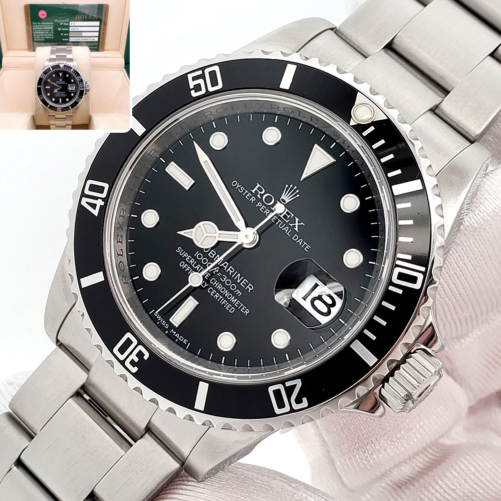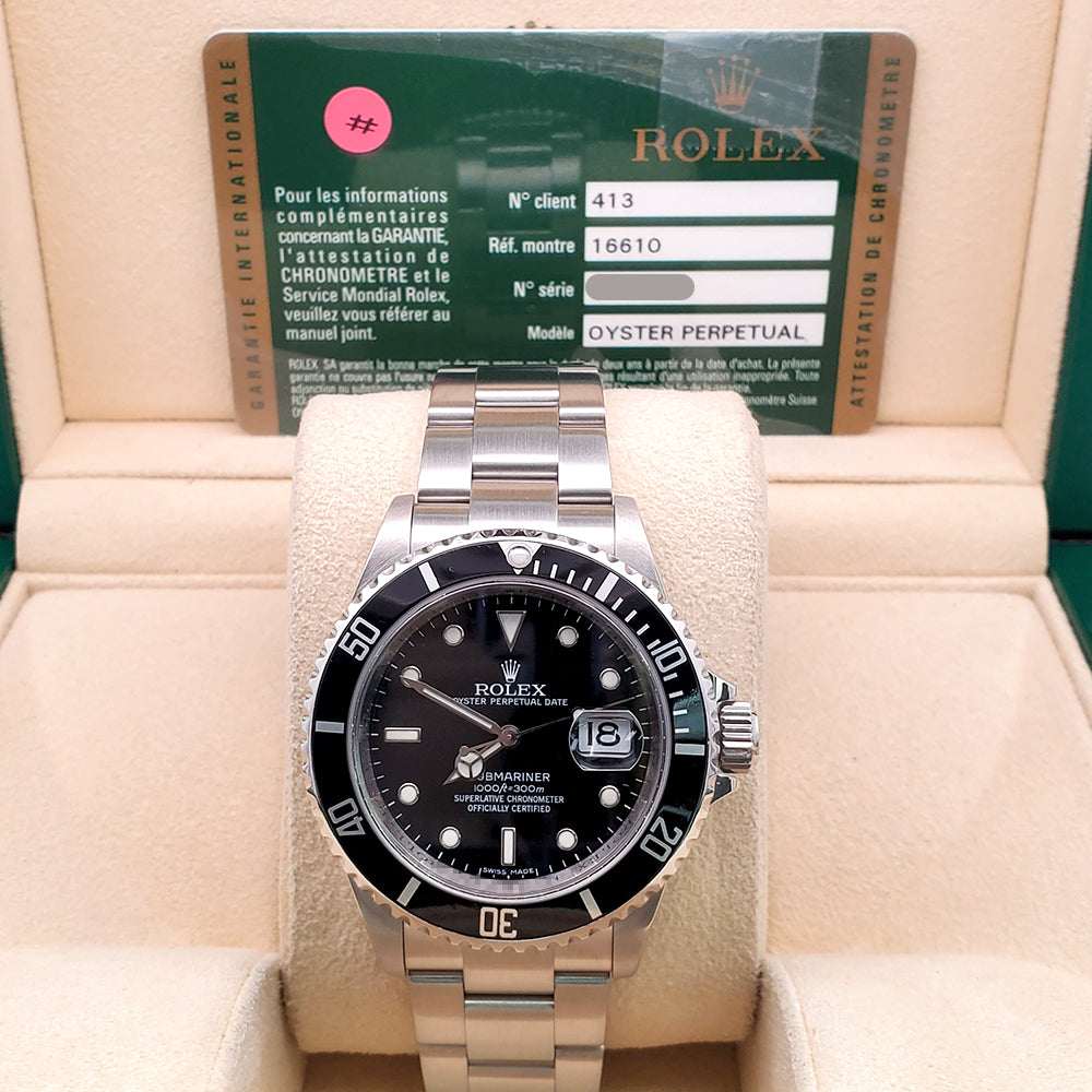 Let’s make a deal! Up for sale is a Rolex Submariner Date 40mm 16610, featuring the engraved rehaut and rugged stainless steel Oyster bracelet. Complete with box and papers for a timeless, collector-ready classic.