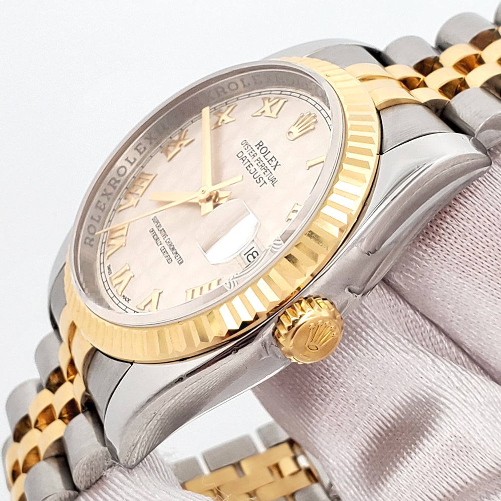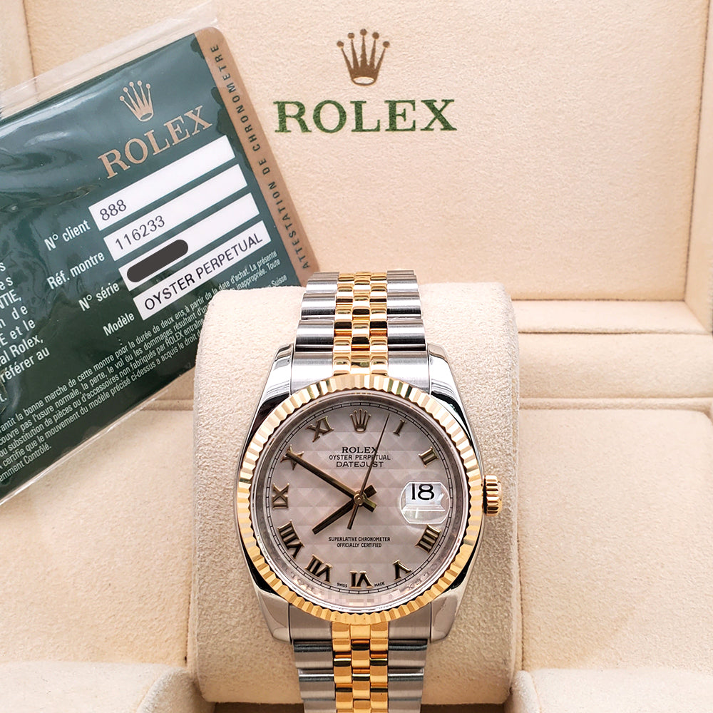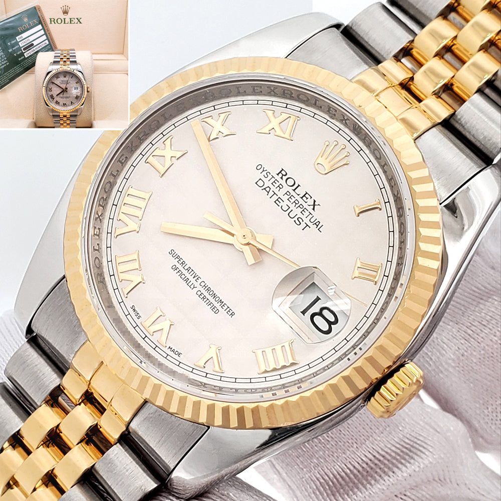 2010 Rolex Datejust Cream Pyramid Roman 2-Tone Yellow Gold/Steel Jubilee 36mm Watch 116233 Box Papers