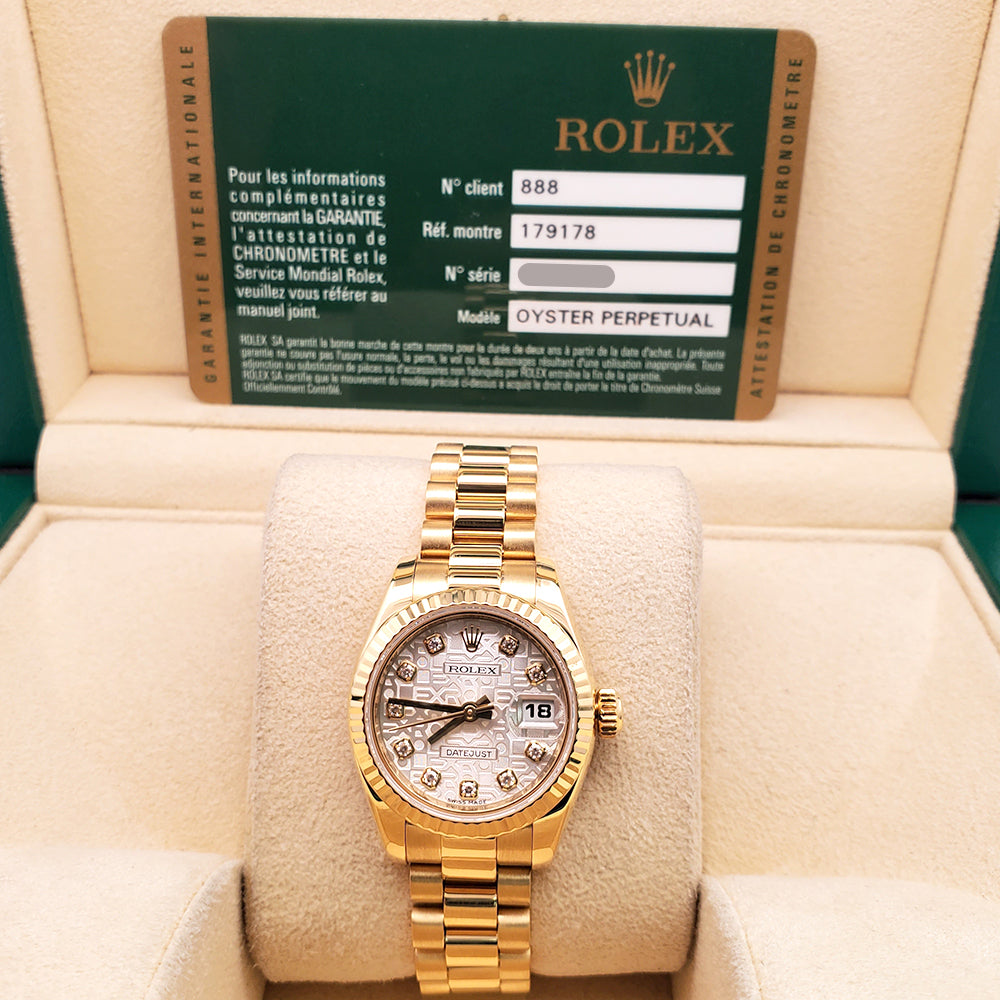 2011 Rolex President Datejust Factory Jubilee Diamond Dial Yellow Gold 26mm Ladies Watch 179178 Box Papers