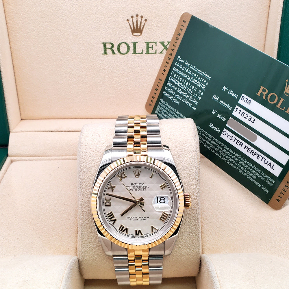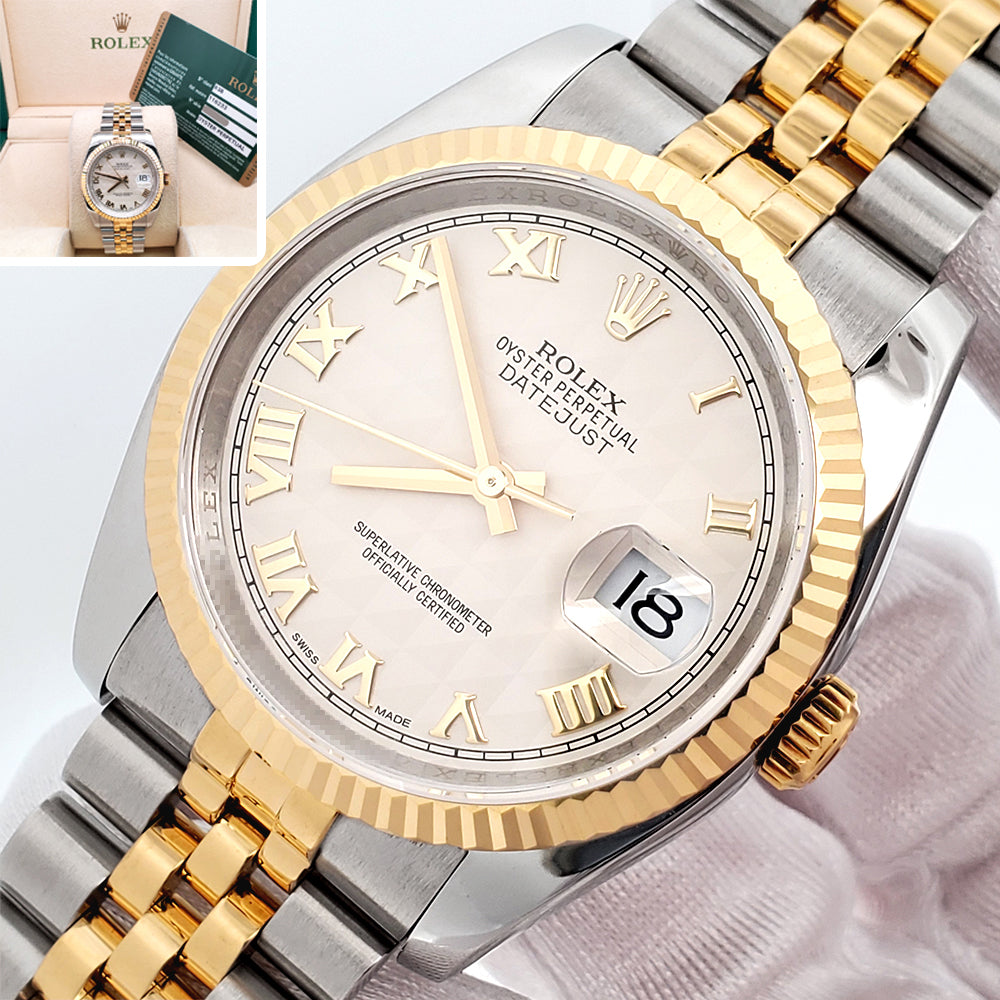 2013 Rolex Datejust Cream Pyramid Roman 2-Tone Yellow Gold/Steel Jubilee 36mm Watch 116233 Box Papers
