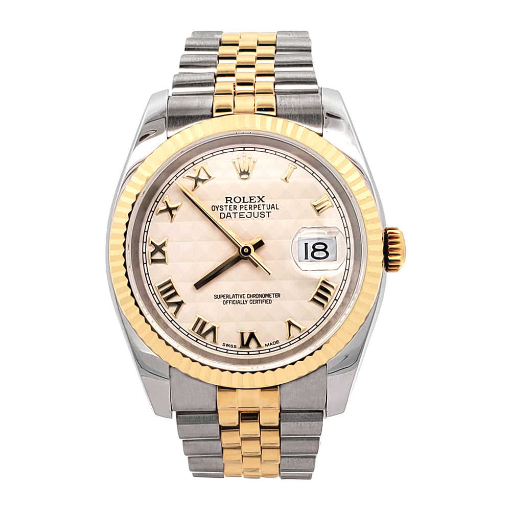 Rolex Datejust 36mm Cream Pyramid Roman 2-Tone Yellow Gold/Steel Jubilee Watch, Ref 116233.
