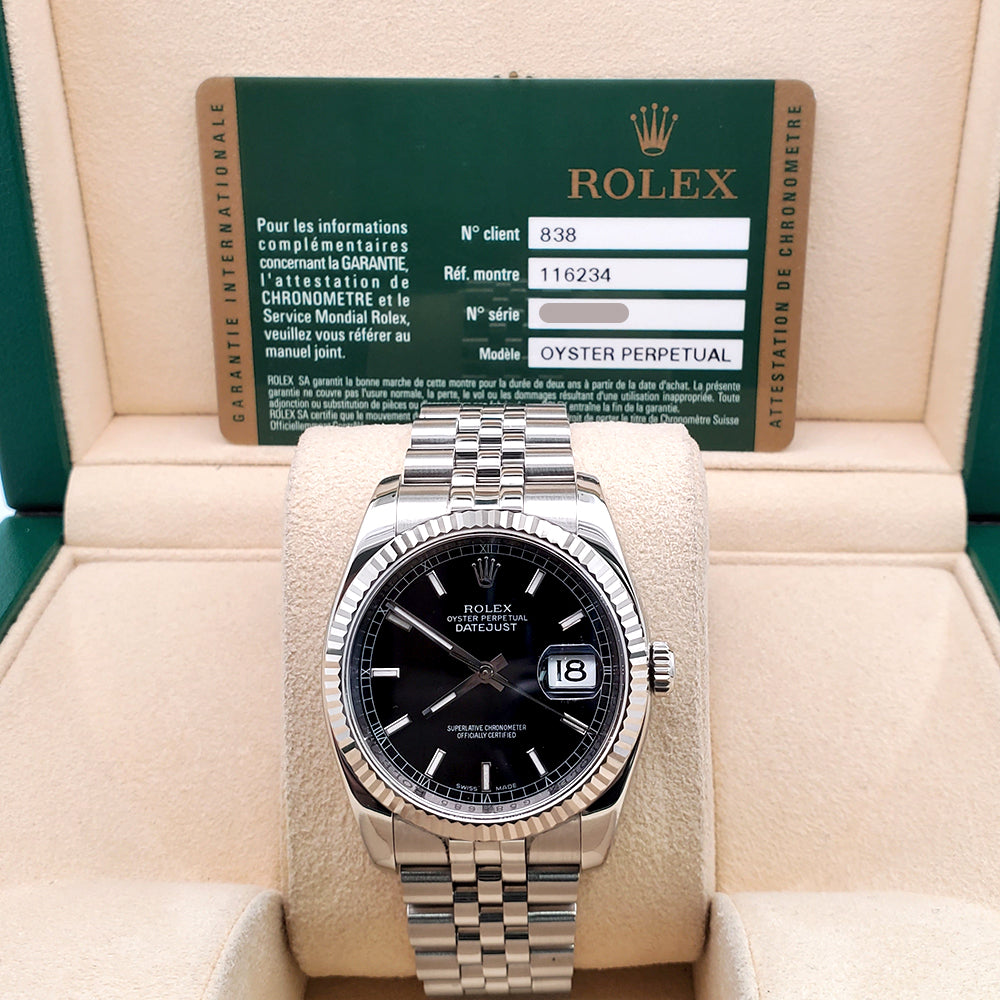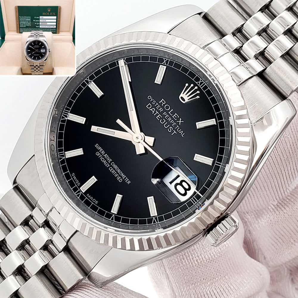 2011 Rolex Datejust Black Index Dial White Gold Fluted Bezel Steel Jubilee 36mm Watch 116234 Box Papers