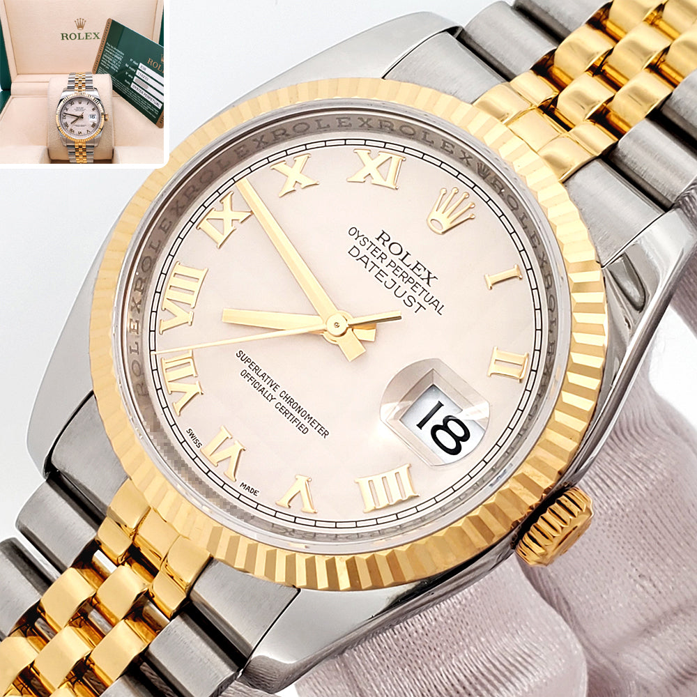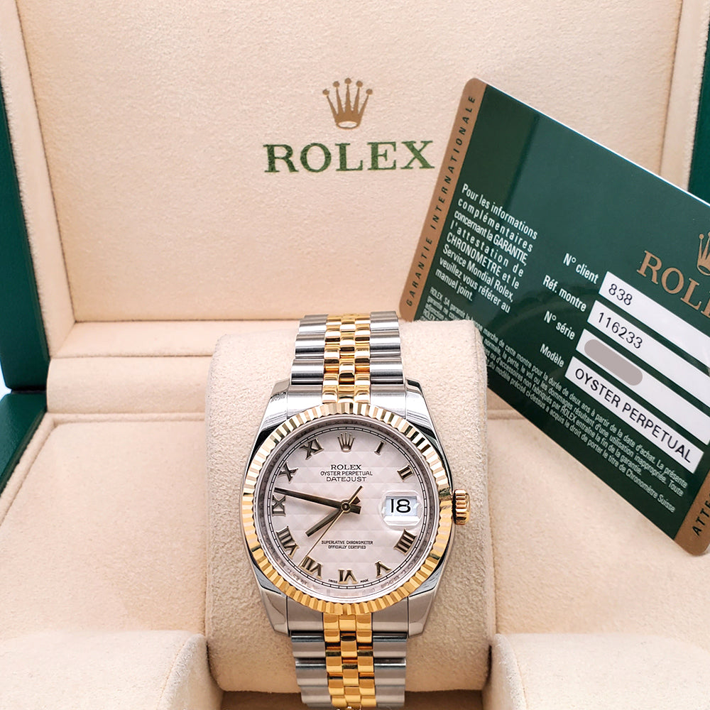 2017 Rolex Datejust Cream Pyramid Roman 2-Tone Yellow Gold/Steel Jubilee 36mm Watch 116233 Box Papers