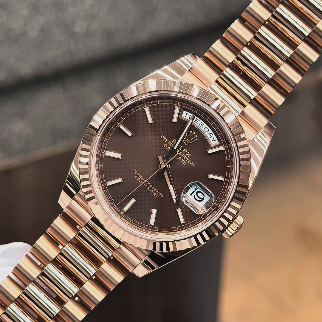 Prestigious elegance 2021 Rolex Day-Date 40mm 228235 in solid rose gold with chocolate motif dial. Complete with box, papers, and tag.