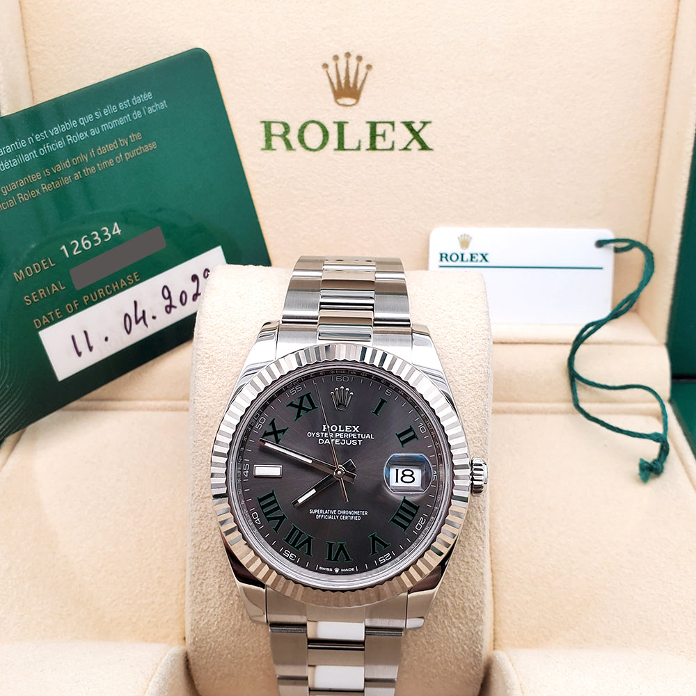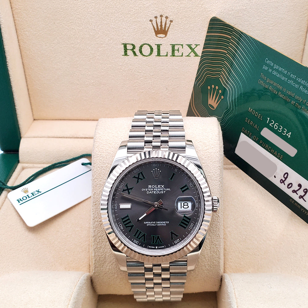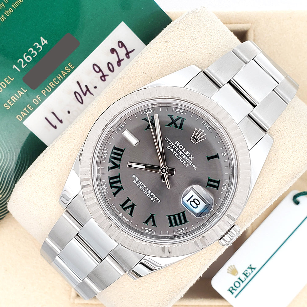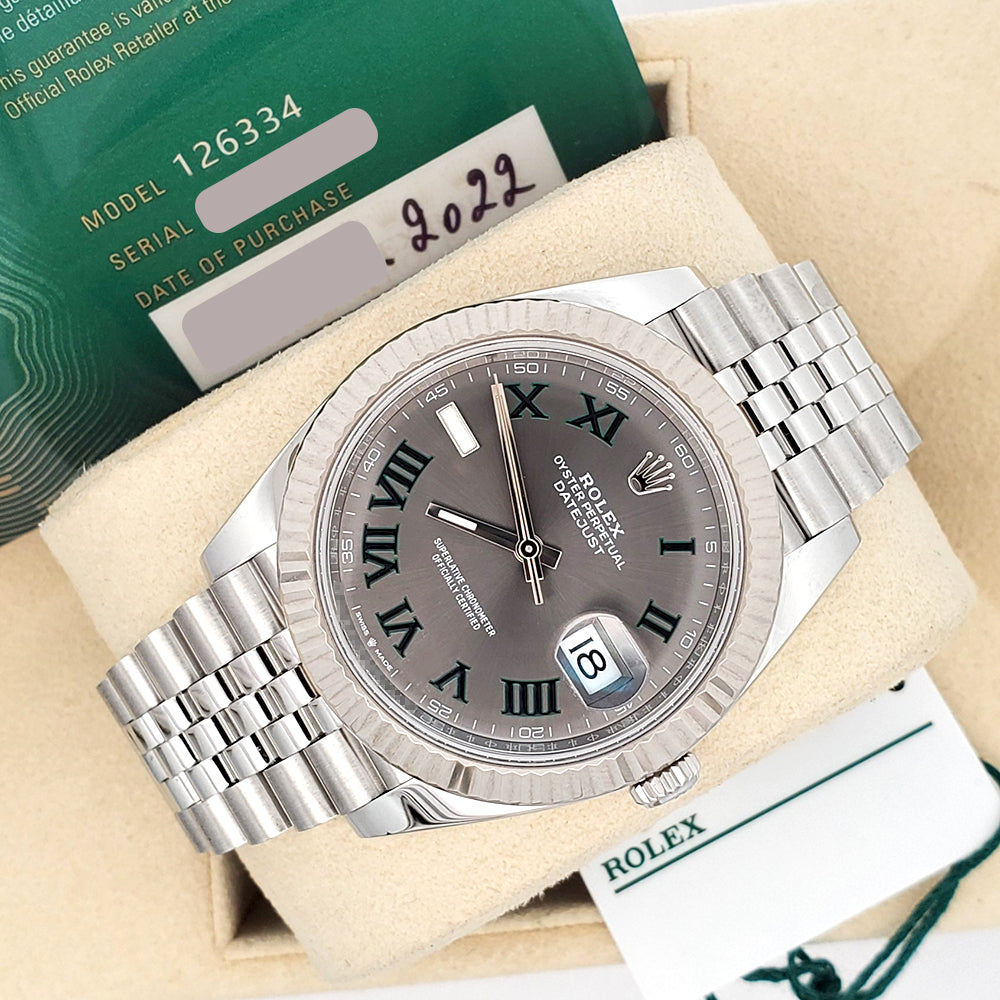 Striking sophistication 2022 Rolex Datejust 41 126334 “Wimbledon” with slate Roman dial, white gold fluted bezel, and steel case. Box, papers, and tag included.