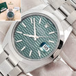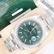 Fresh and distinctive  2023 unworn Rolex Datejust 41 with green motif dial and steel Oyster bracelet. Box, papers, and tag included.