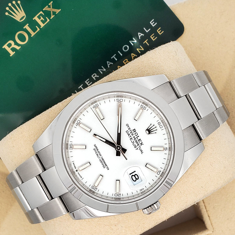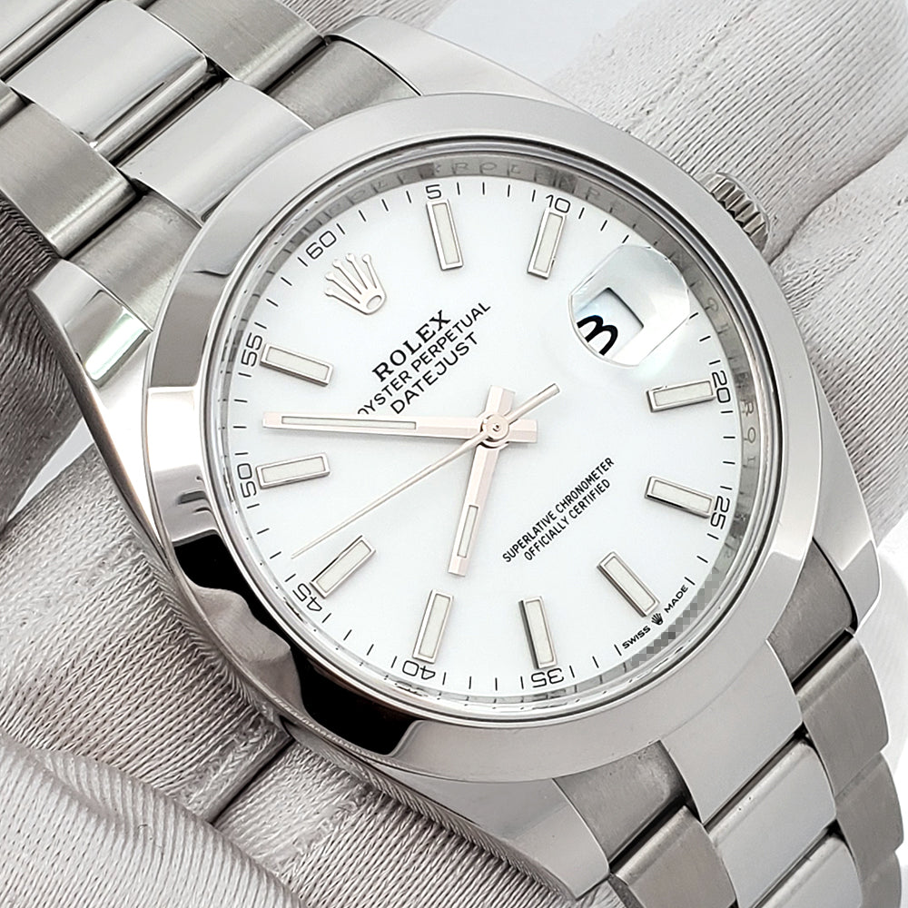 The 2024 Rolex Datejust 41 126300 features a clean white index dial and stainless steel construction, offering a refined look with a reliable automatic movement for everyday luxury.