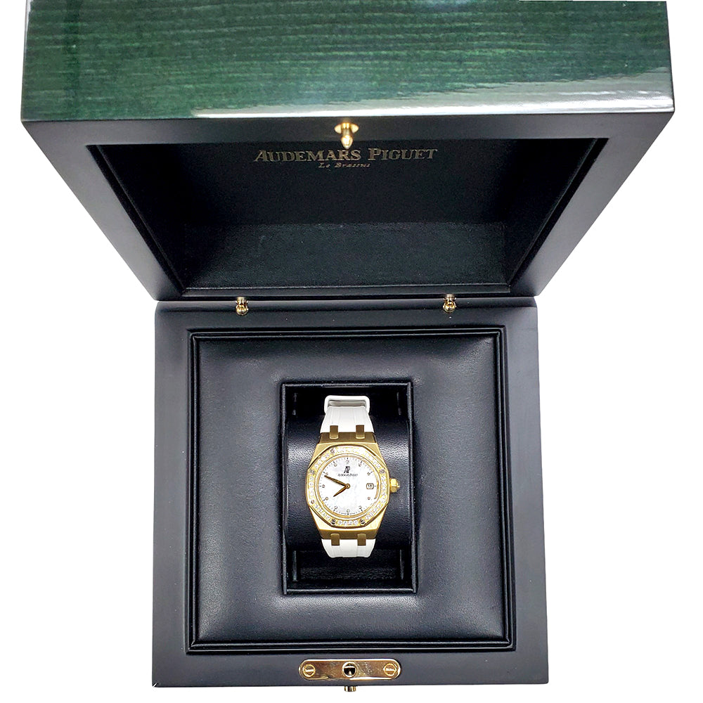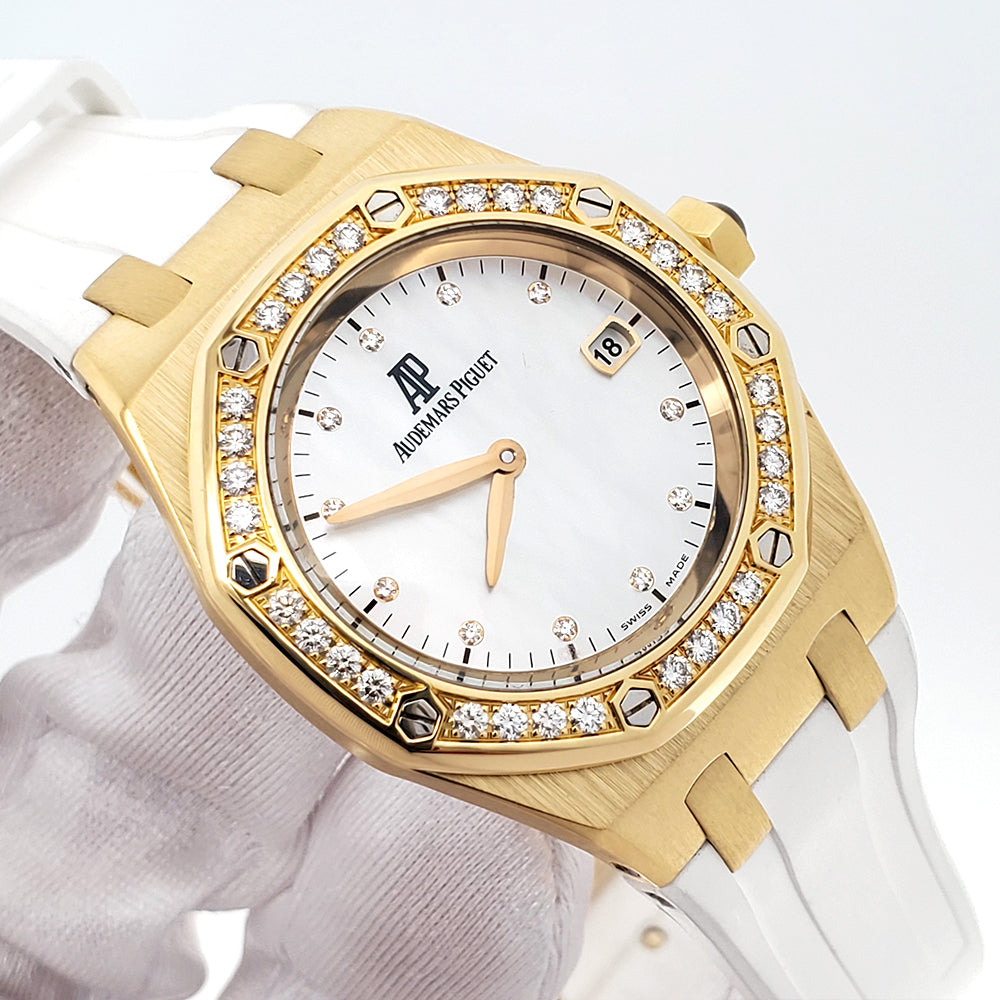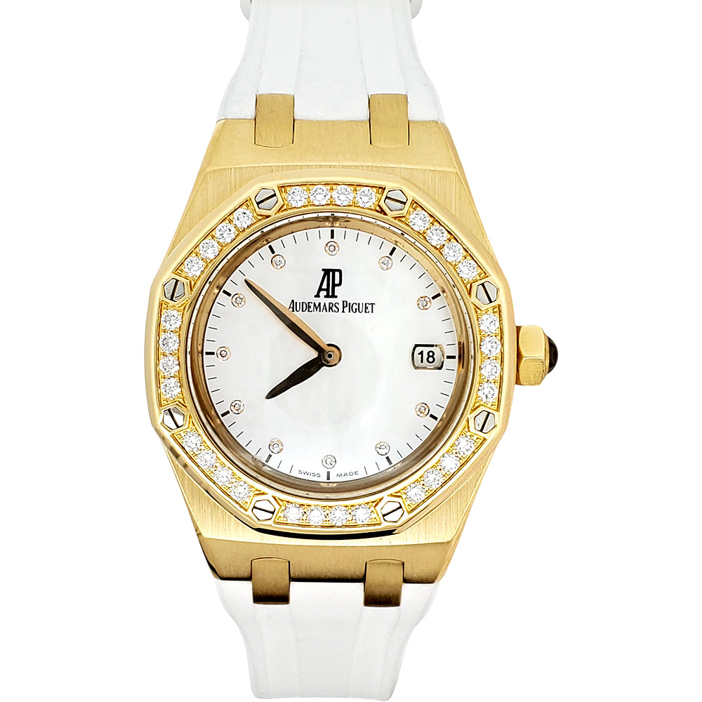 Let’s make a deal! Up for sale is an Audemars Piguet Royal Oak Lady 33mm 67601BA, crafted in yellow gold with factory white mother-of-pearl diamond dial and bezel. A rare, elegant statement piece.