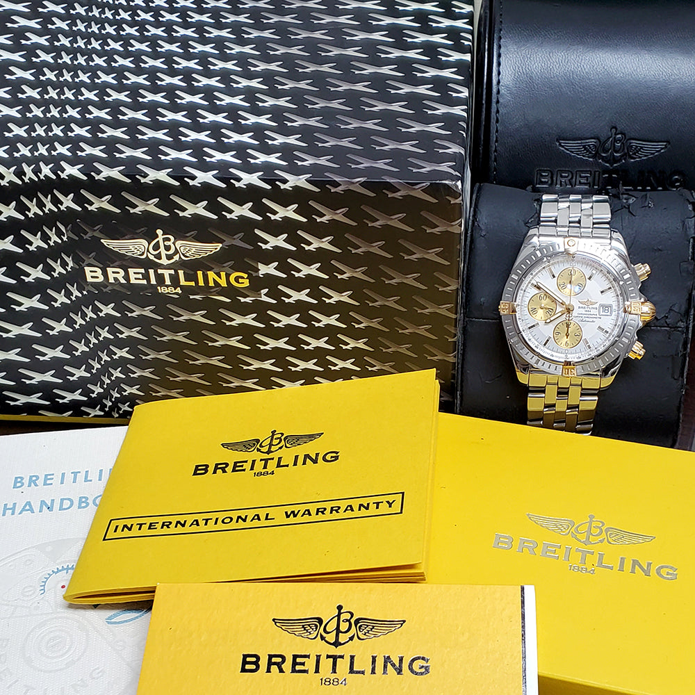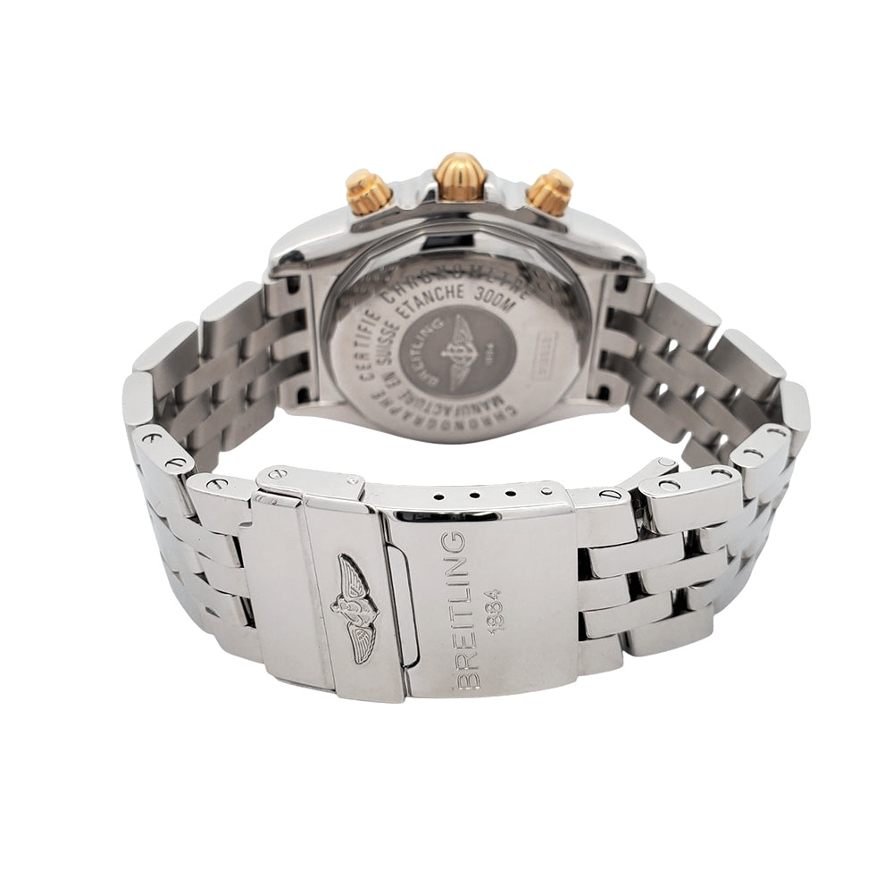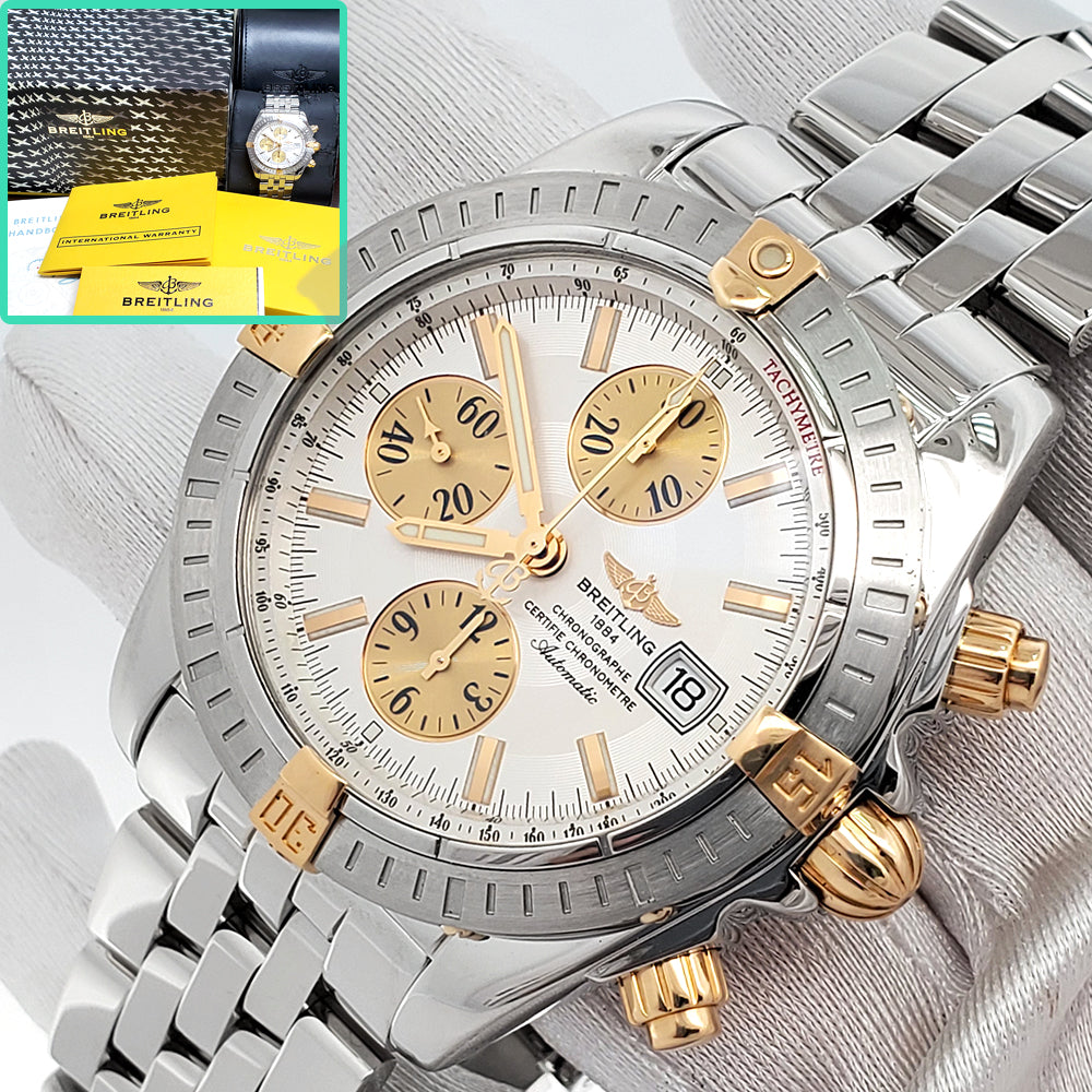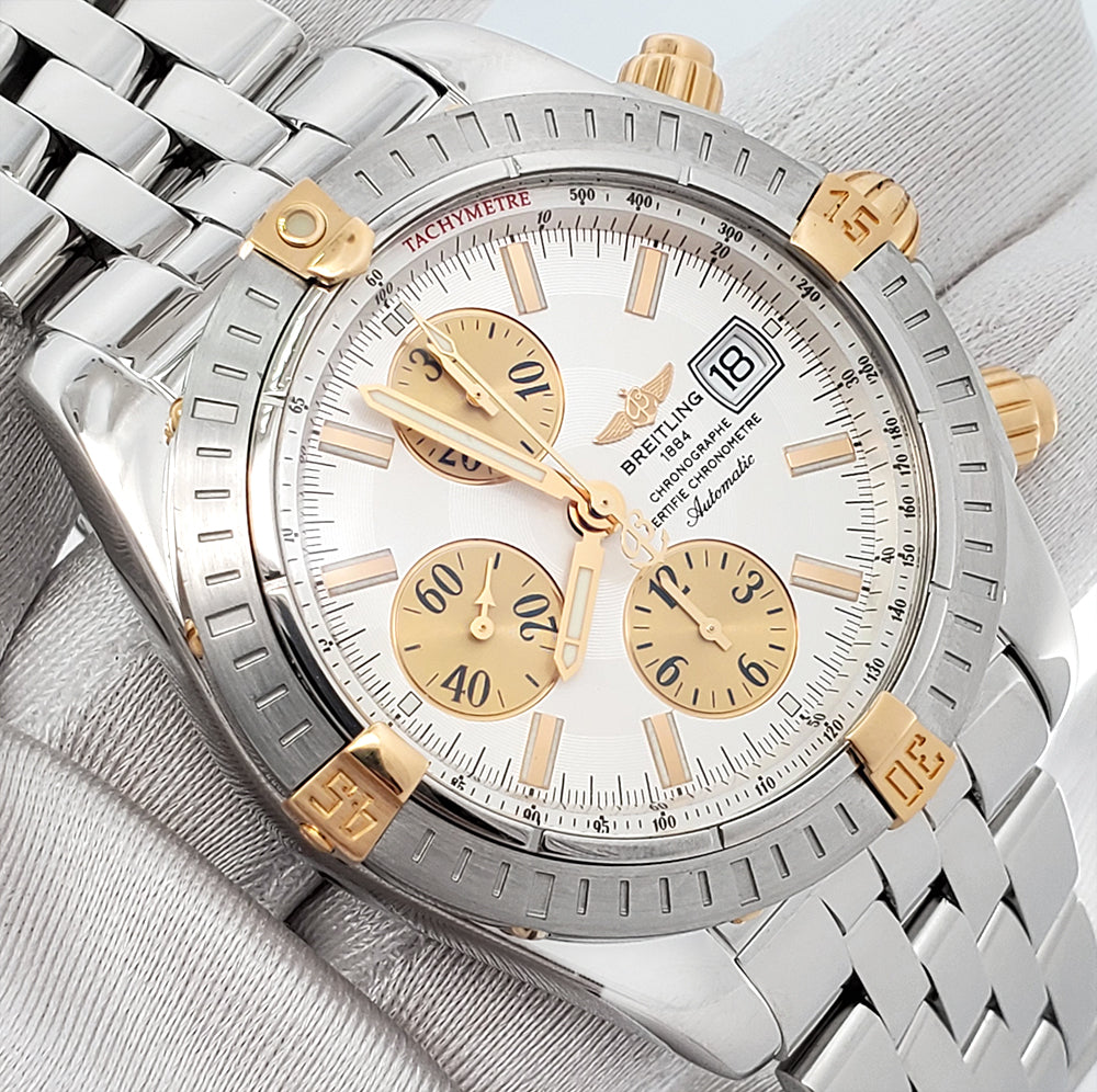 The Breitling Chronomat Evolution B13356 features a 44mm case with a silver concentric dial and two-tone design. A reliable chronograph, it combines luxury with performance, offering precision and style for any occasion.