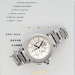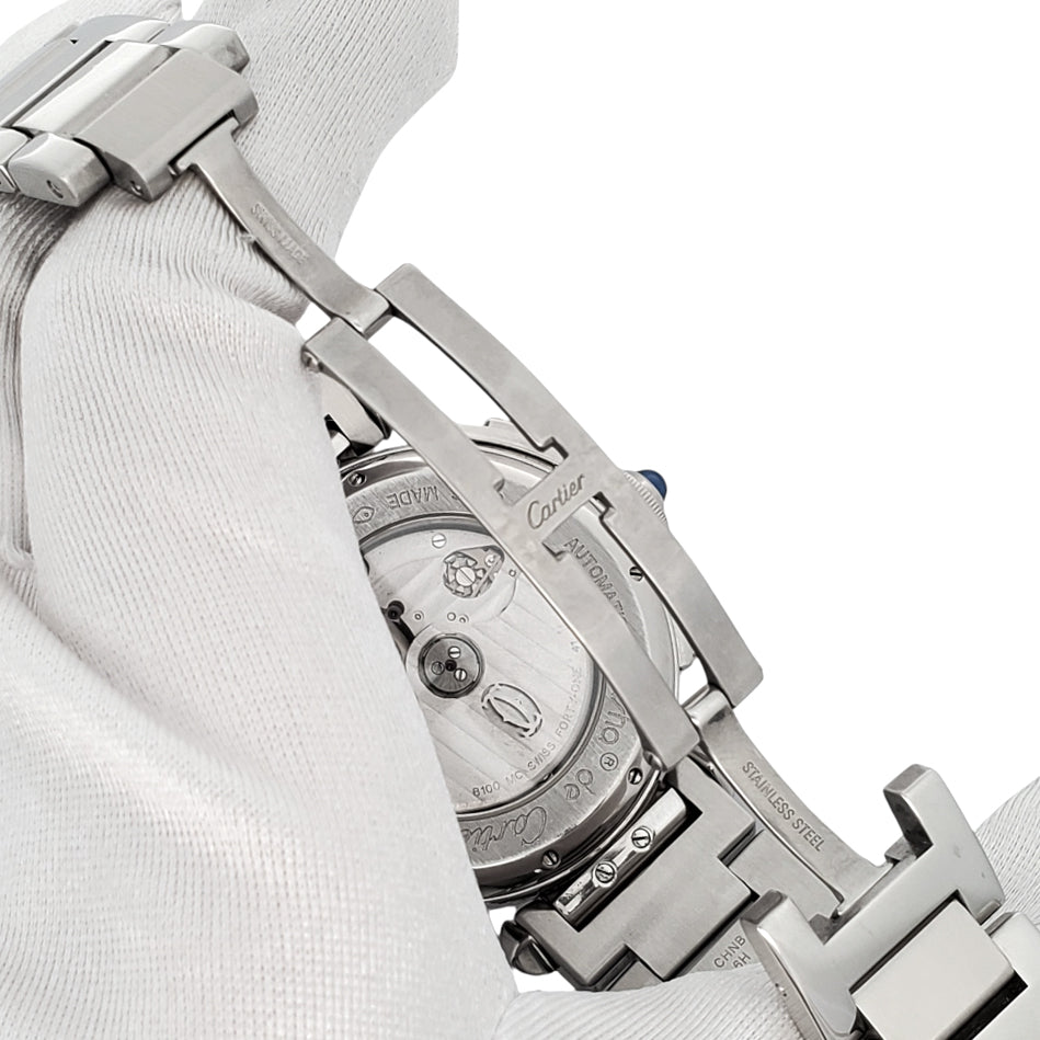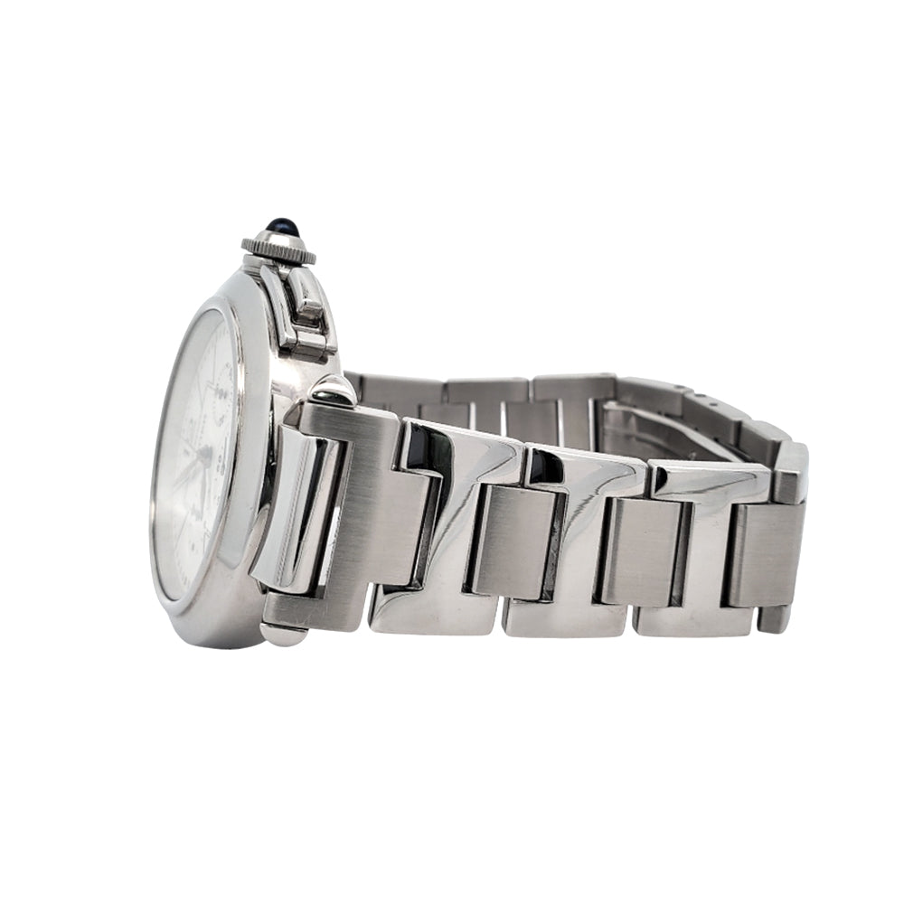 The Cartier Pasha Chronograph W31085M7 stands out with its 42mm stainless steel case, bold Arabic numerals, and screw-down crown cover, offering sporty elegance with unmistakable Cartier flair.