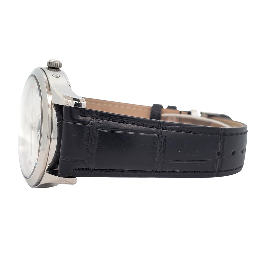 Strap / Bracelet Black leather strap with Jaeger LeCoultre stainless steel double-deployant buckle.