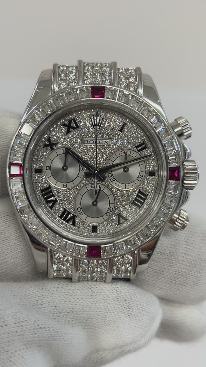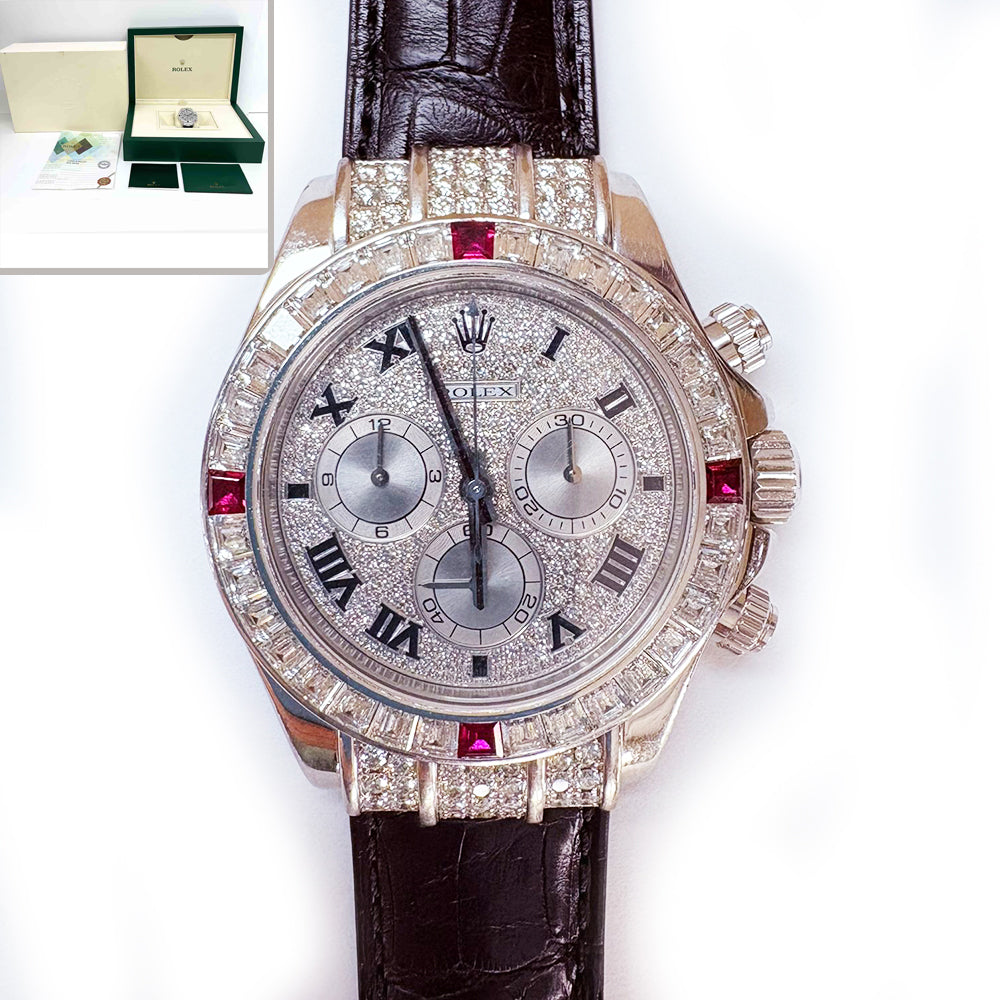 Rolex Cosmograph Daytona 4 Rubies & Baguette Diamonds Bezel White Gold 116599 40mm Box Papers