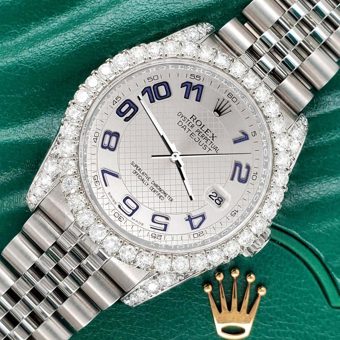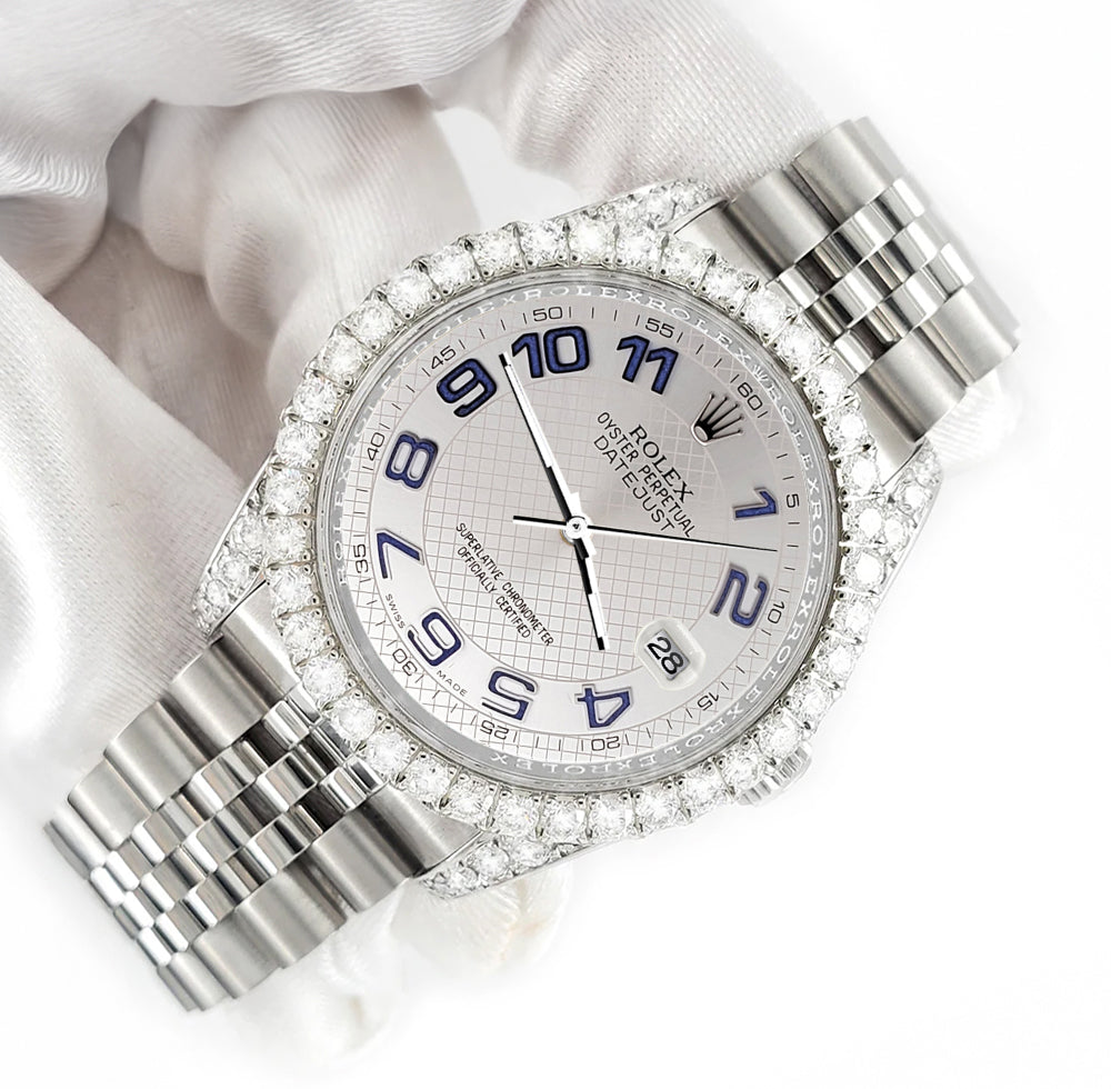 Radiant artistry Rolex Datejust 36mm 116200 with 3.9ct custom diamond bezel and lugs, featuring a silver decorated blue Arabic dial in stainless steel. A flawless union of elegance and luxury.
