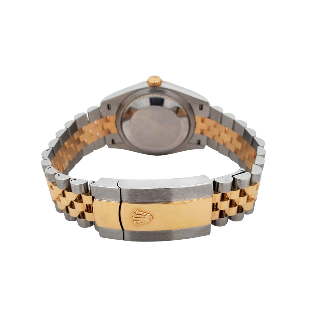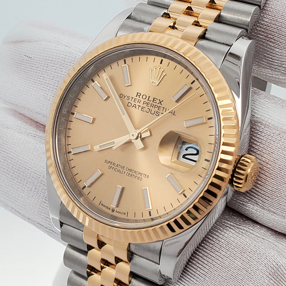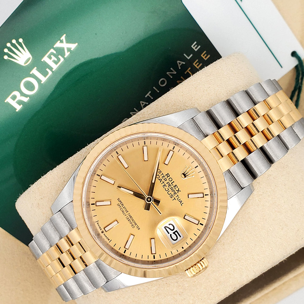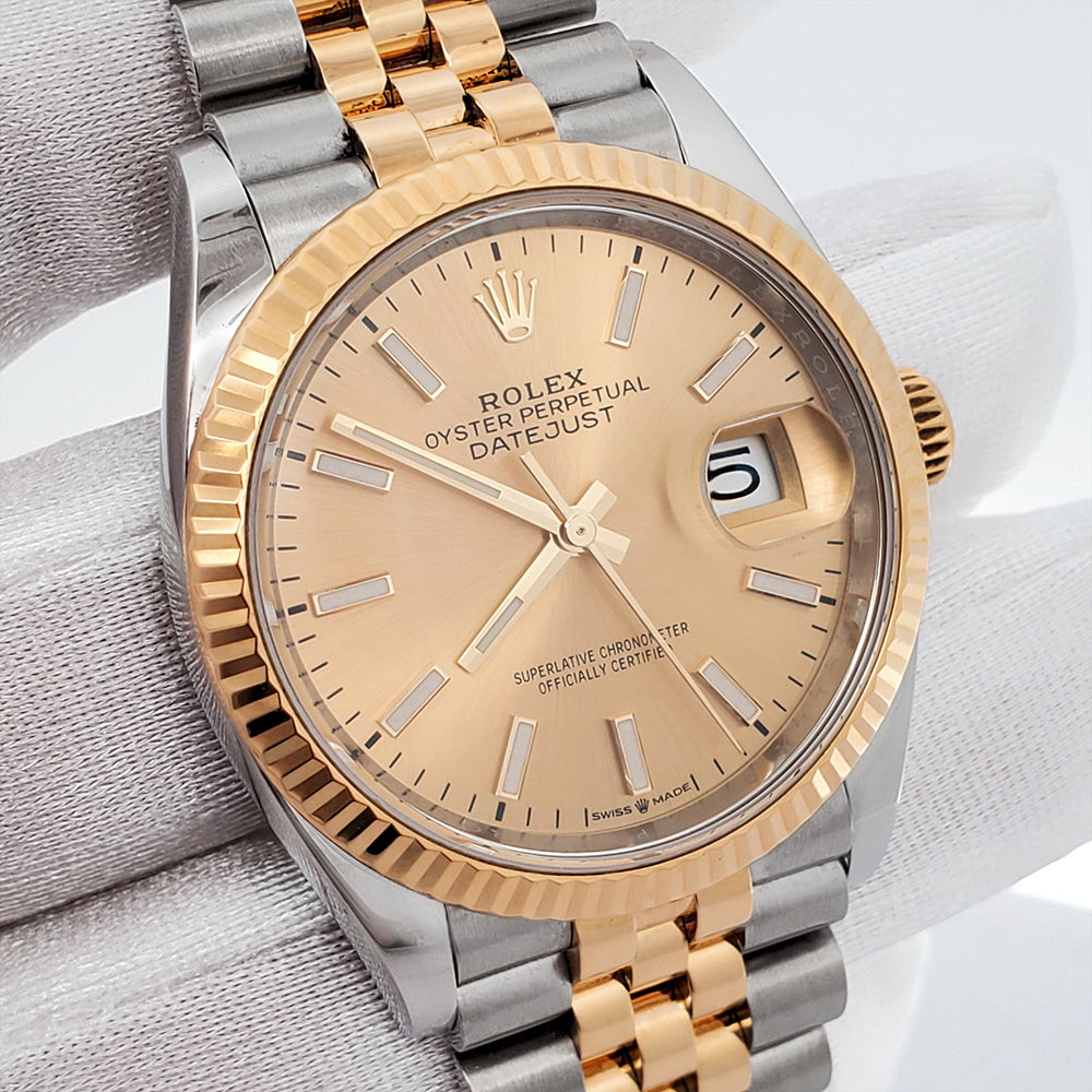 The Rolex Datejust 126233 features a 36mm case with a champagne index dial, a fluted bezel, and a two-tone yellow gold and steel design. The Jubilee bracelet adds timeless elegance to this iconic model.