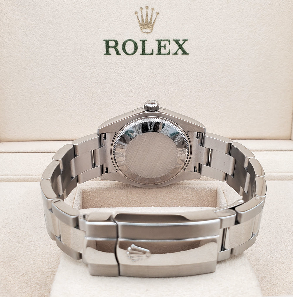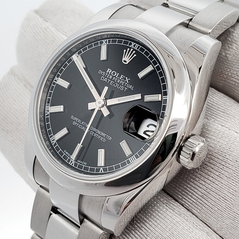 The Rolex Datejust 31 Ref. 178240 features a sleek black dial with index markers, housed in a 31mm stainless steel case and Oyster bracelet—blending elegance and everyday reliability.