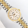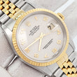 Radiant and refined, this 36 mm Rolex Datejust 16233 showcases a silver Arabic dial and iconic two‑tone yellow gold and steel Jubilee bracelet.