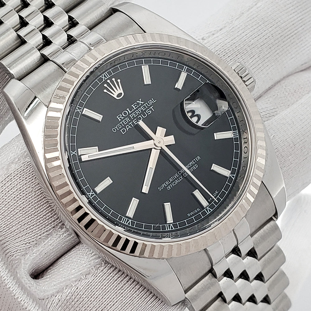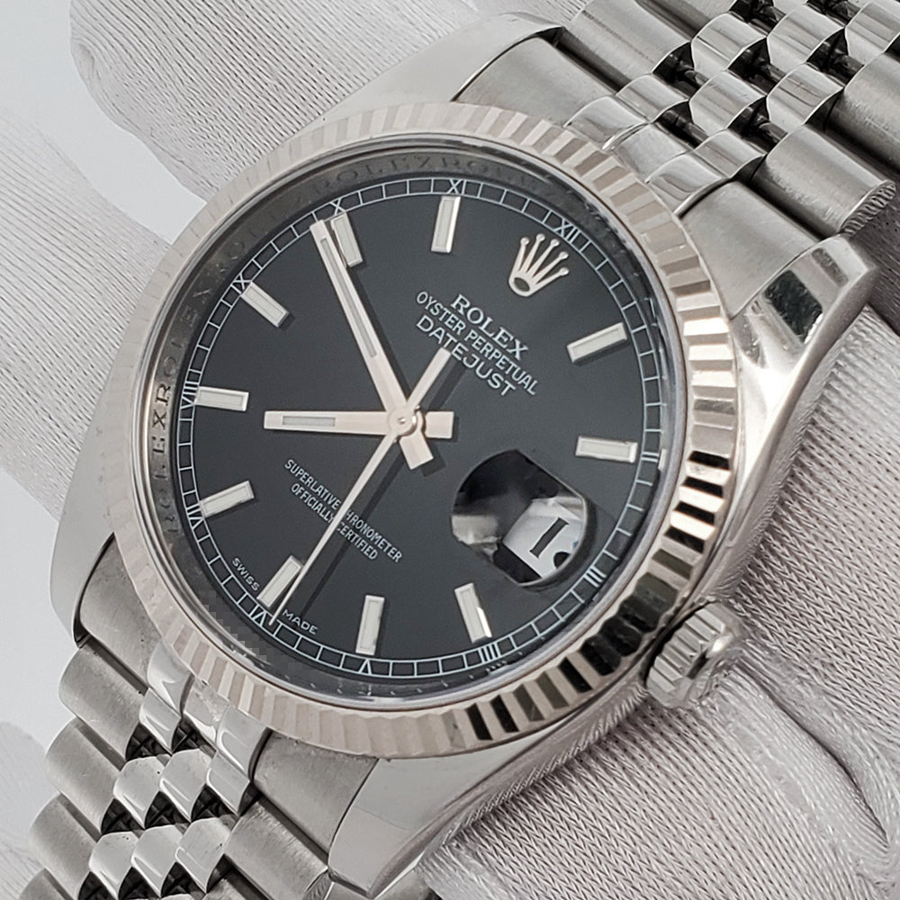 Rolex Datejust 36mm Black Index Dial White Gold Fluted Bezel Steel Jubilee Watch 116234 Box Papers