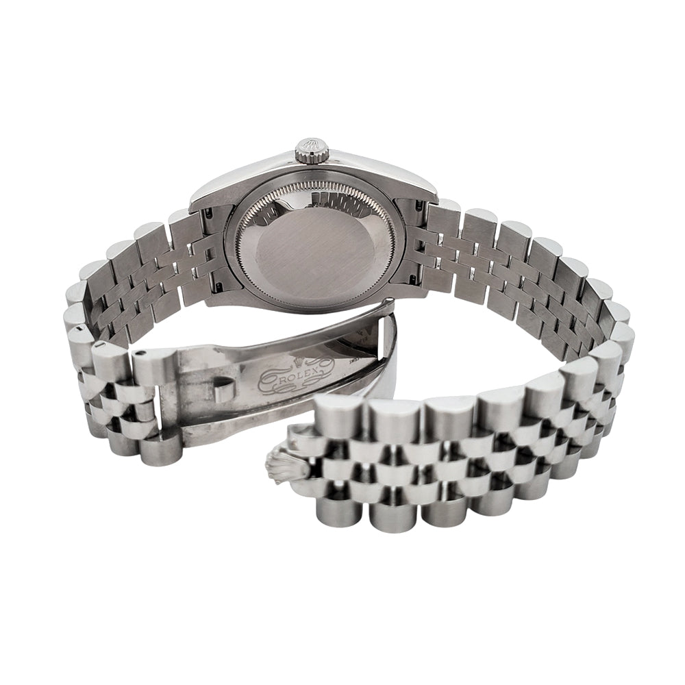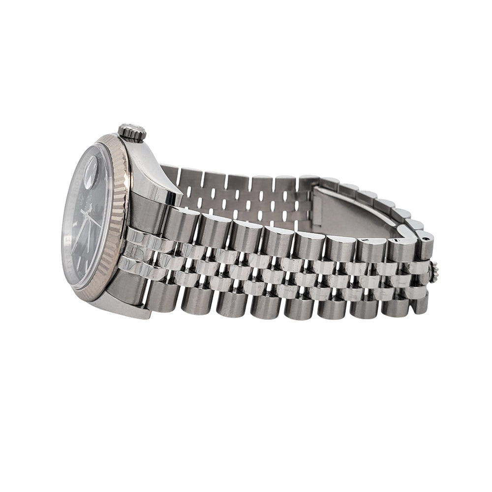The Rolex Datejust 116234 combines a sleek black index dial with a white gold fluted bezel and steel Jubilee bracelet, offering a perfect balance of elegance and precision for any occasion.