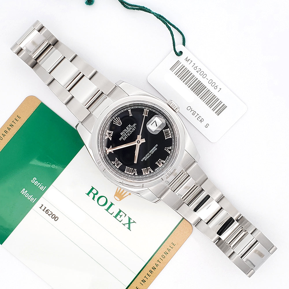 Rolex Datejust 36mm Black Roman Dial Steel Oyster Watch 116200 Papers/Tag