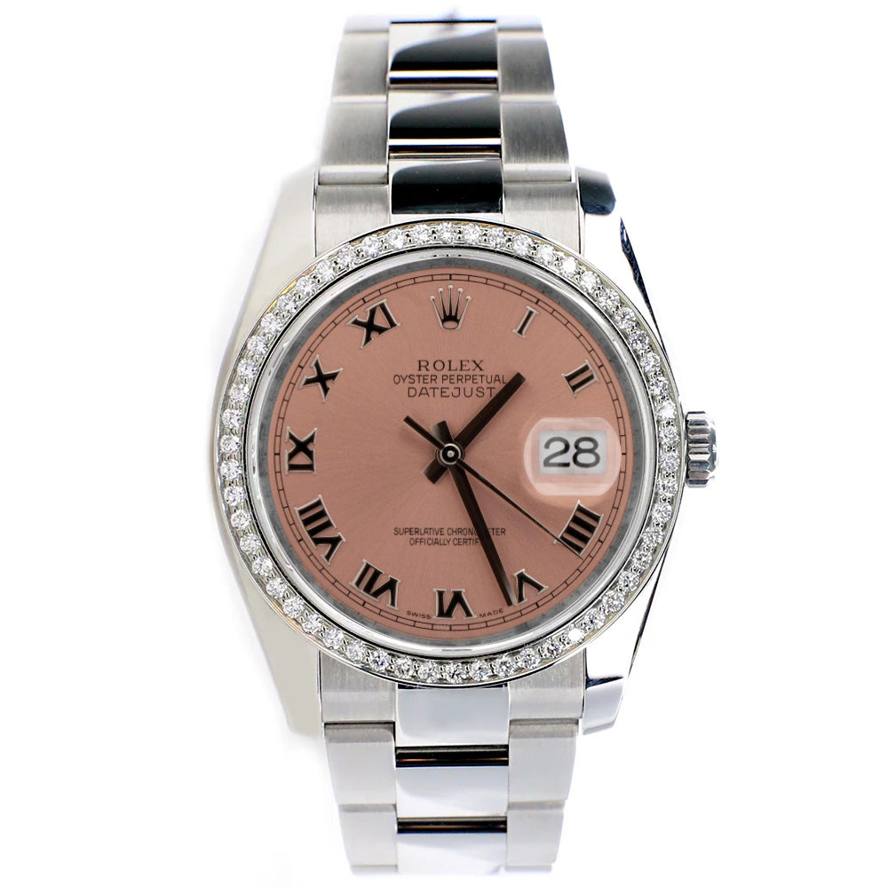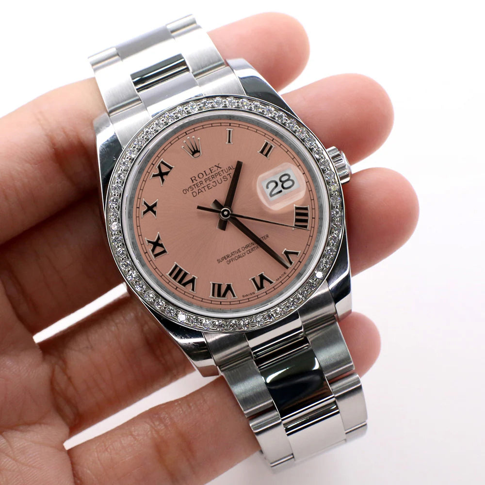 Rolex Datejust 36mm Salmon Roman Dial Oyster Watch with custom VS1 Diamond Bezel 116200