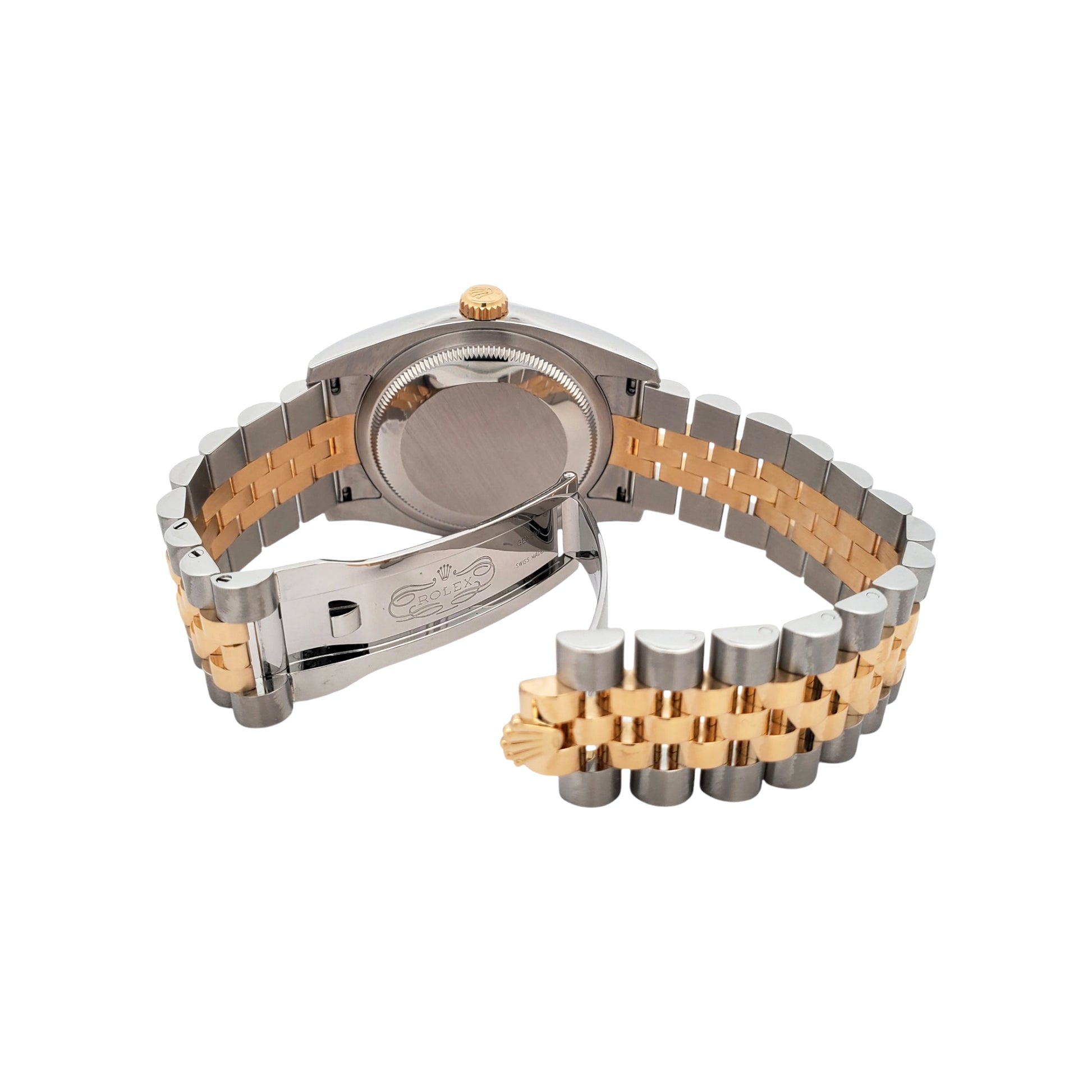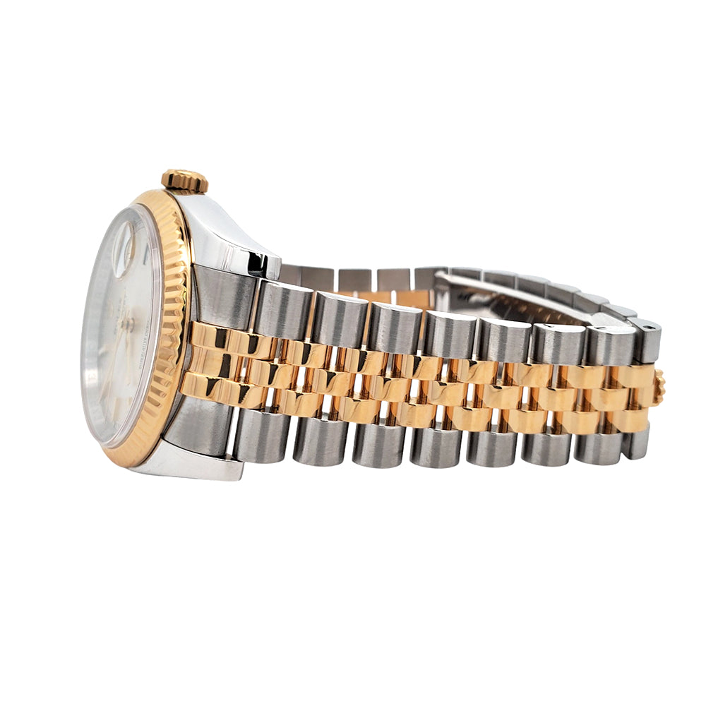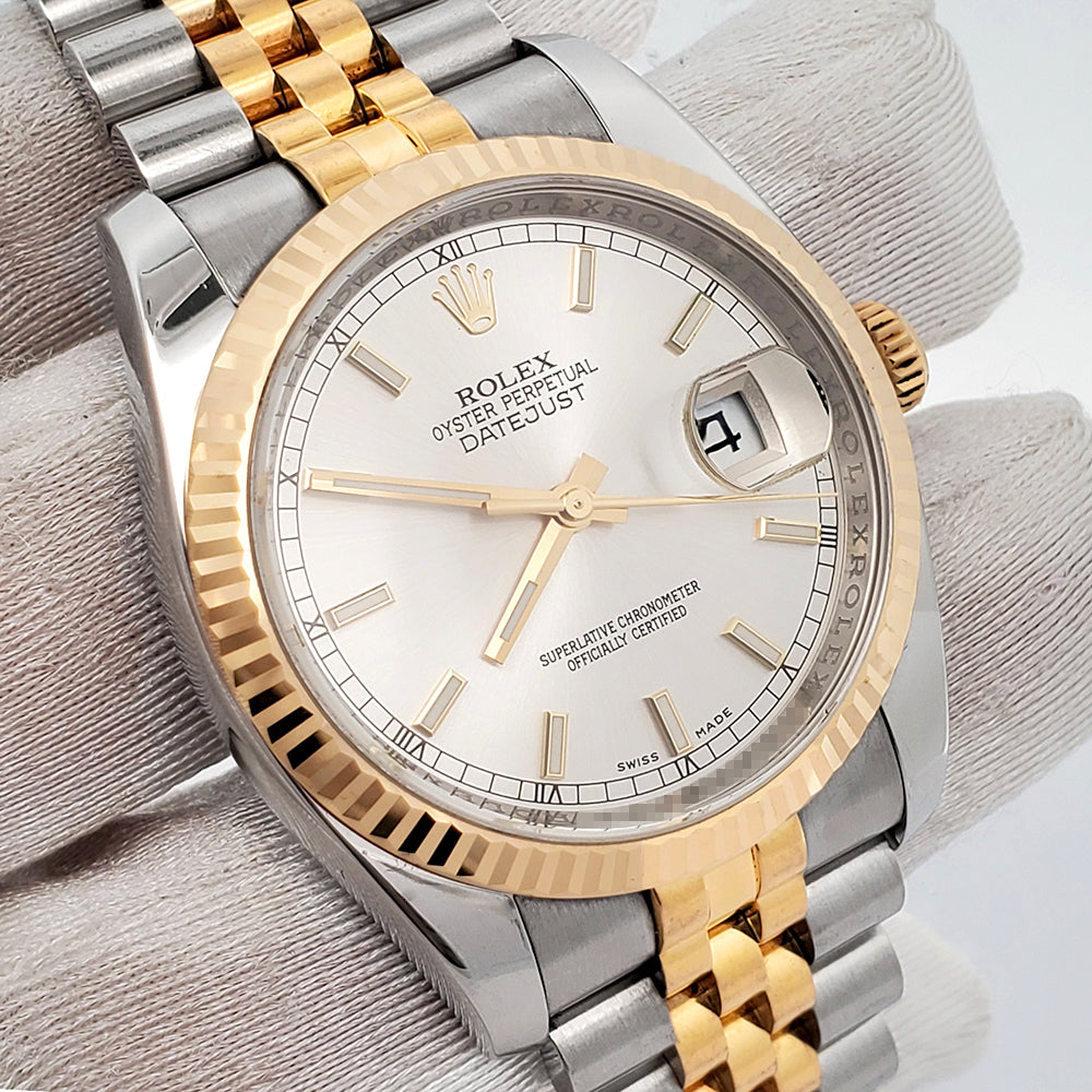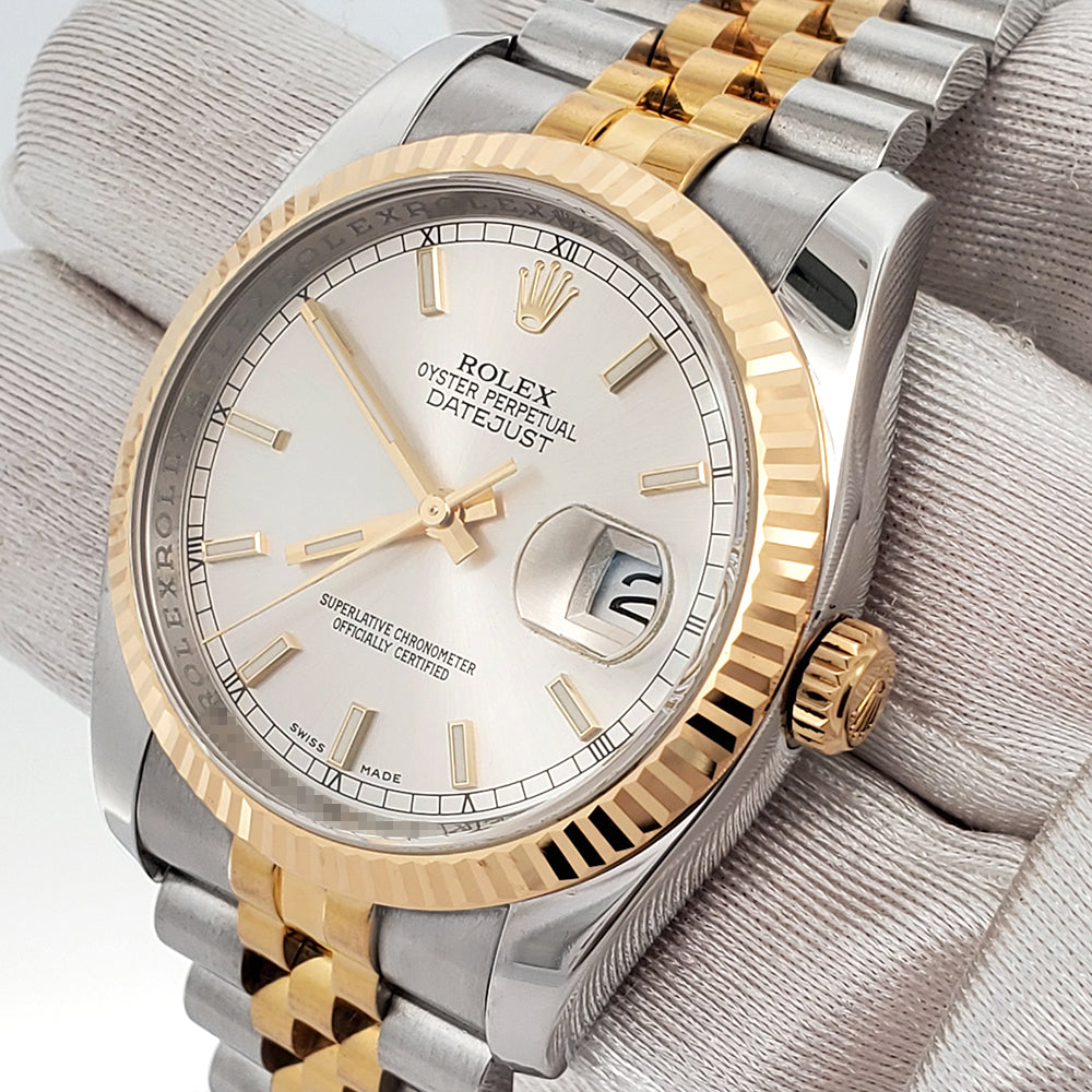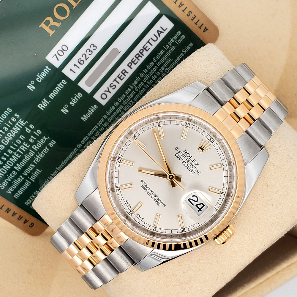 The Rolex Datejust 116233 features a sleek silver index dial, set in a two-tone yellow gold and steel case. Its 36mm size, Jubilee bracelet, and included box and papers offer luxury and value.