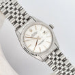 This Rolex Datejust 36 mm ref. 16014 features a silver linen dial, white-gold fluted bezel, and Jubilee bracelet—timeless vintage elegance