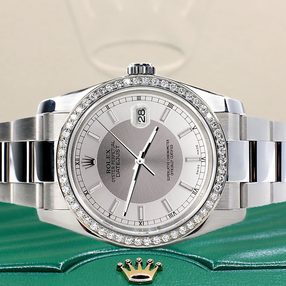 Rolex Datejust 36mm Silver Tuxedo Dial Oyster Watch with custom VS1 Diamond Bezel 116200