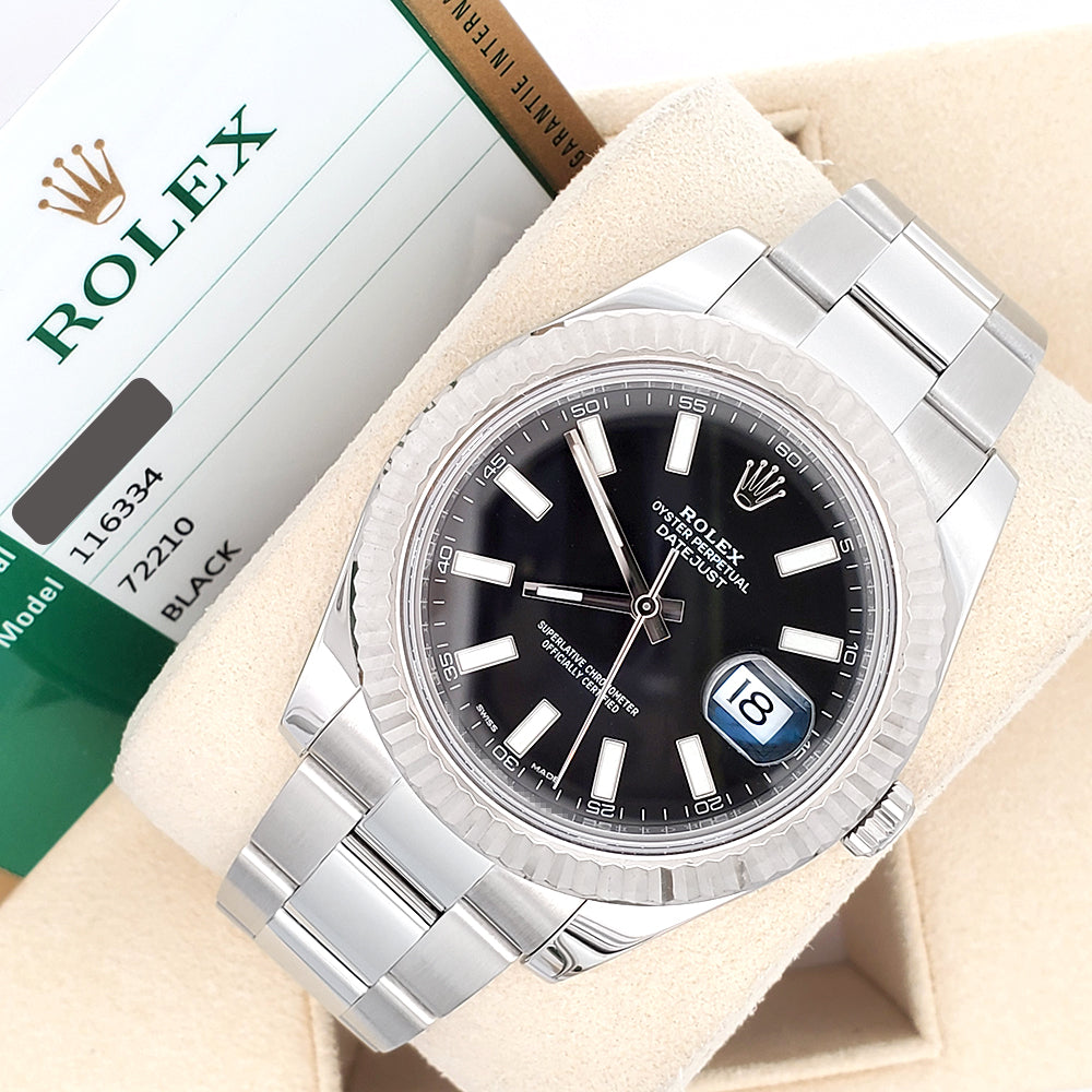 Rolex Datejust II 116334 Black Index Dial White Gold Fluted Bezel Steel 41mm Watch Box Papers