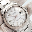 This Rolex Datejust II 41mm 116334 features a white index dial, 18k white gold fluted bezel, and steel Oyster bracelet—timeless sophistication.
