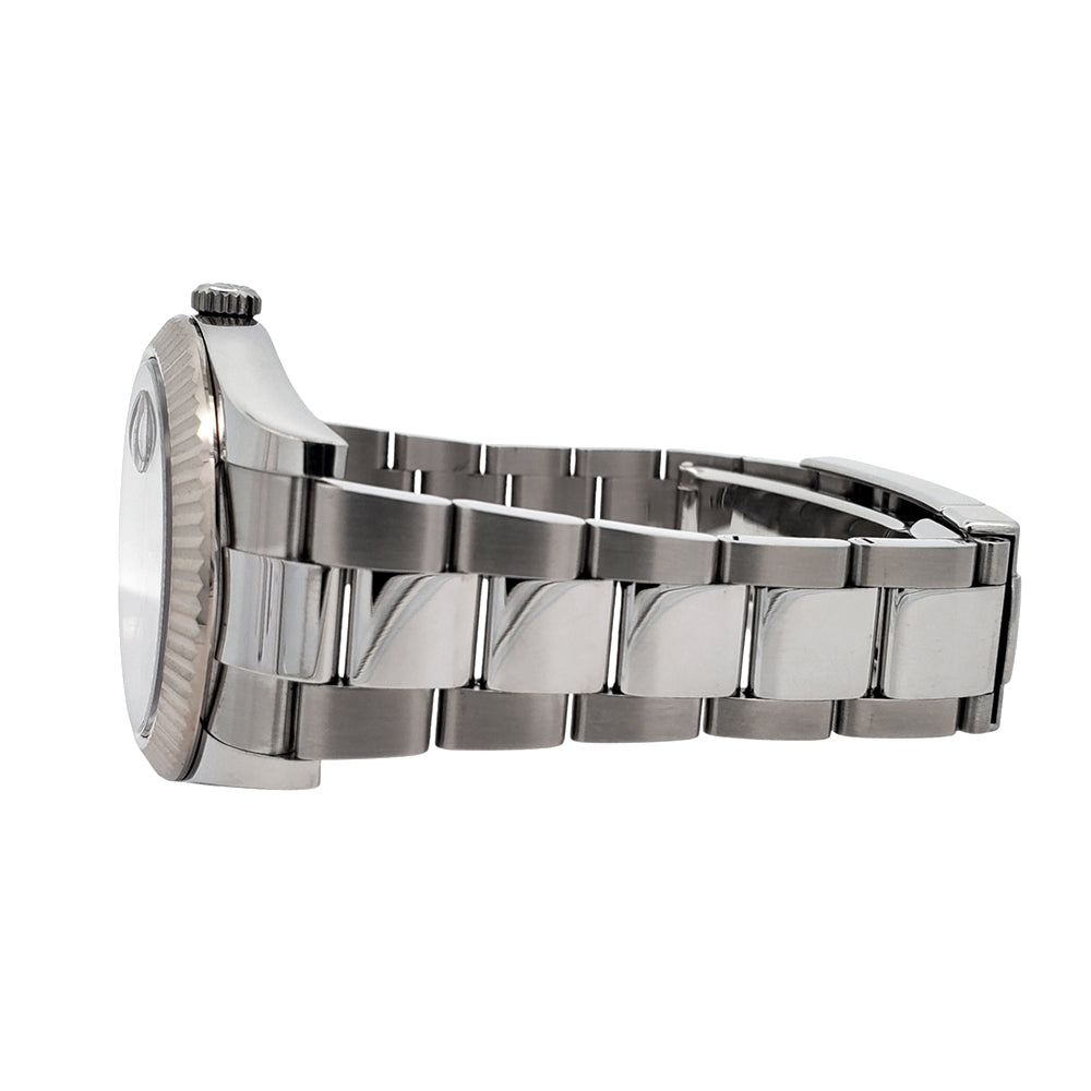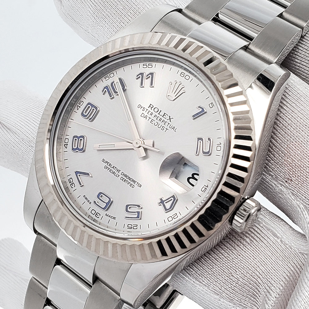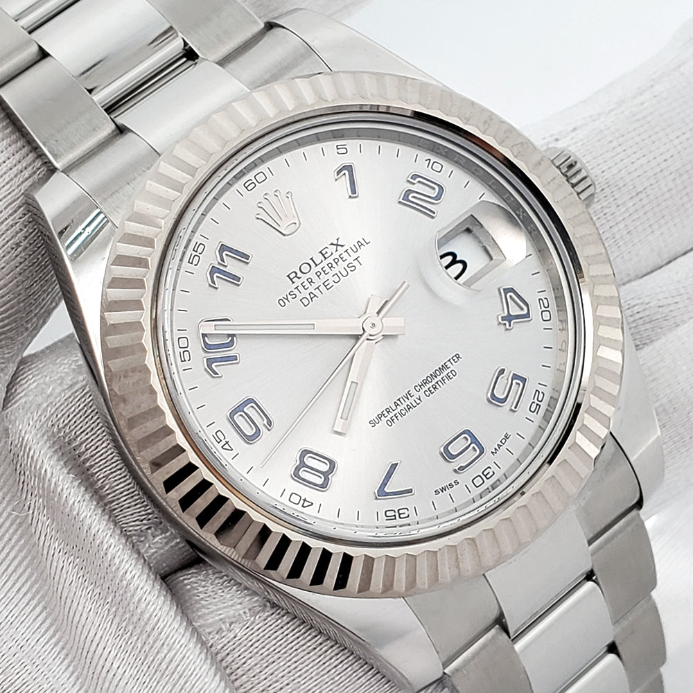 The Rolex Datejust II 116334 blends modern style with classic sophistication, featuring a rhodium Arabic dial, white gold fluted bezel, and a 41mm steel case, making it a standout statement piece.