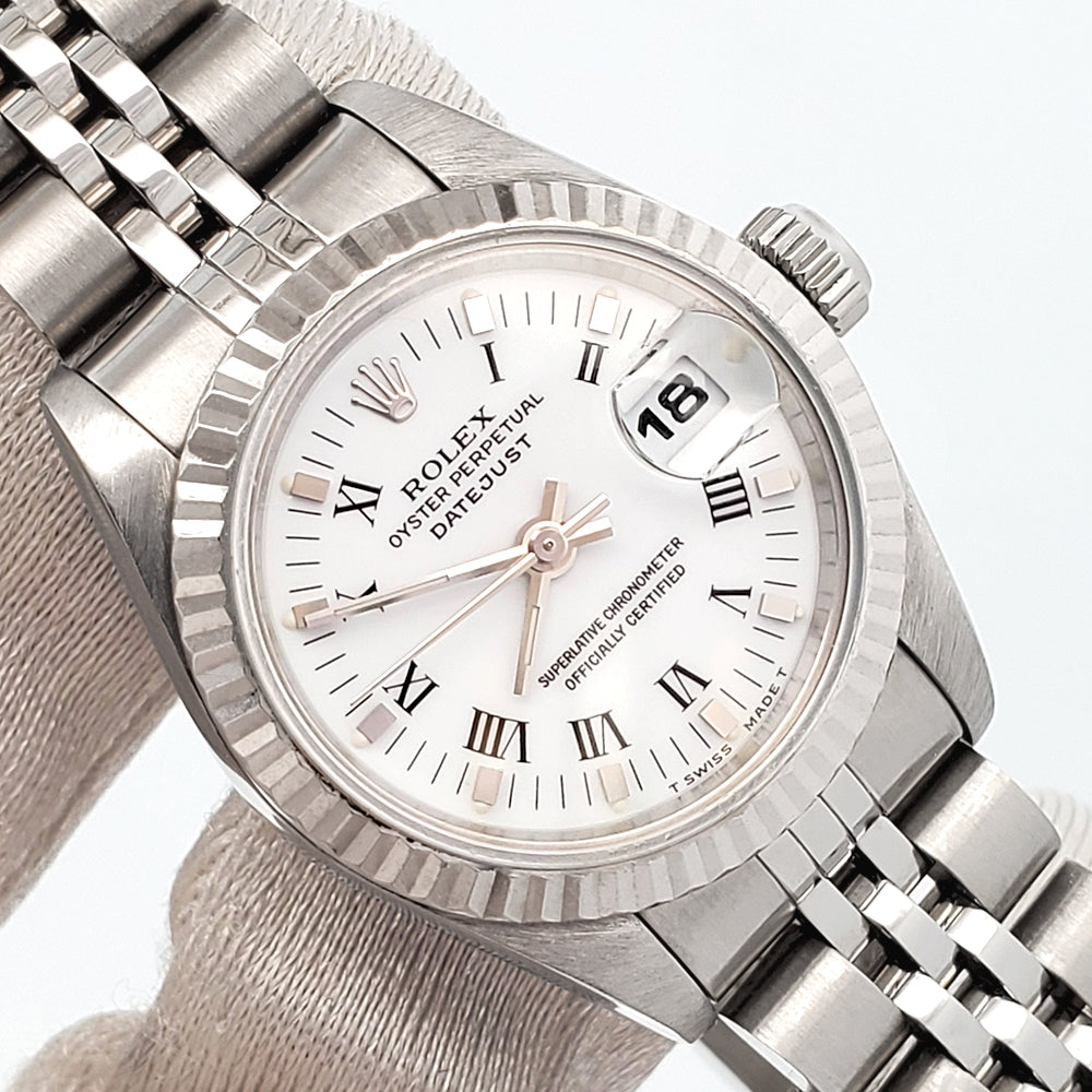 Rolex Datejust Ladies White Roman Dial Gold Fluted Bezel 26mm Steel Jubilee Watch 69174