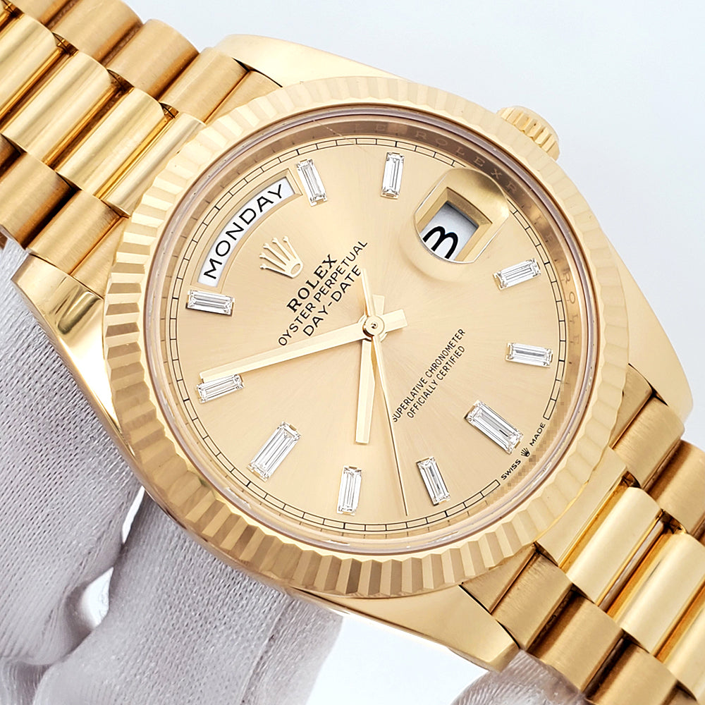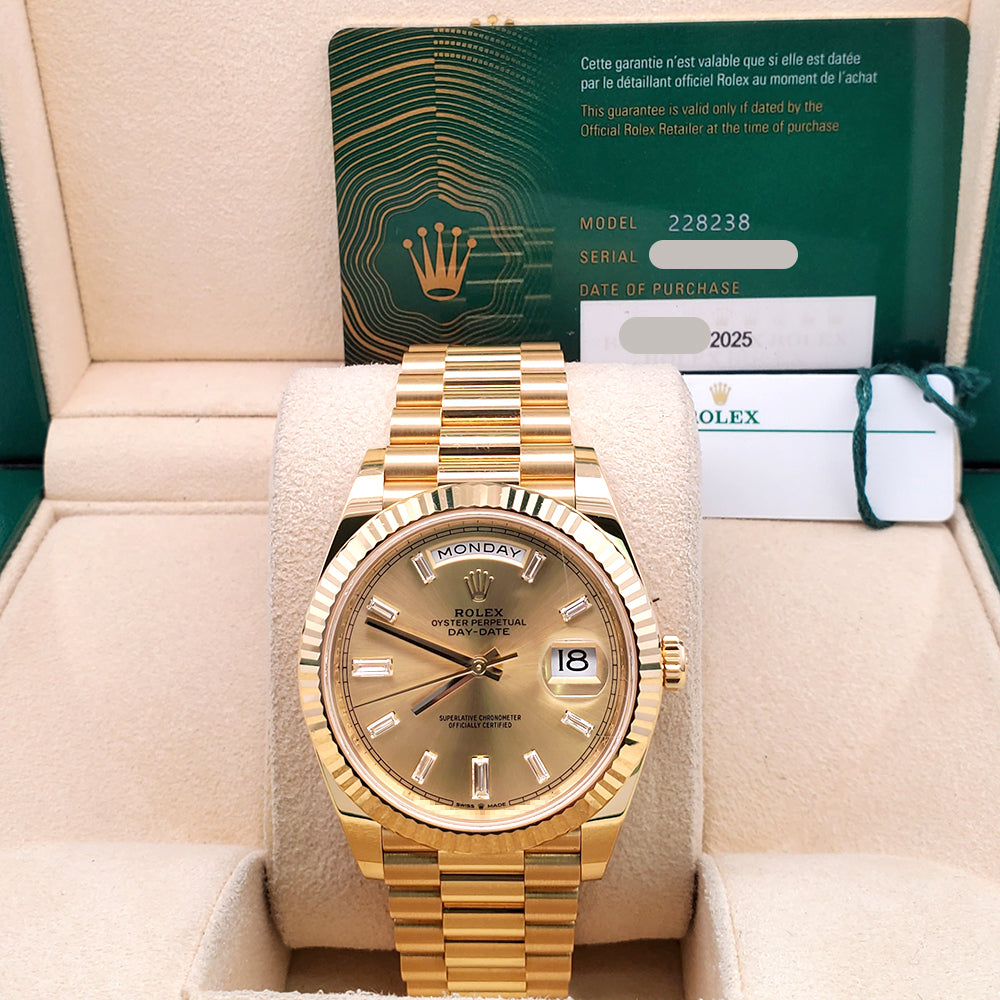 2025 Rolex Day-Date 40 President Factory Champagne Baguette Diamond Dial Yellow Gold Men's Watch 228238 Box/Papers/Tag
