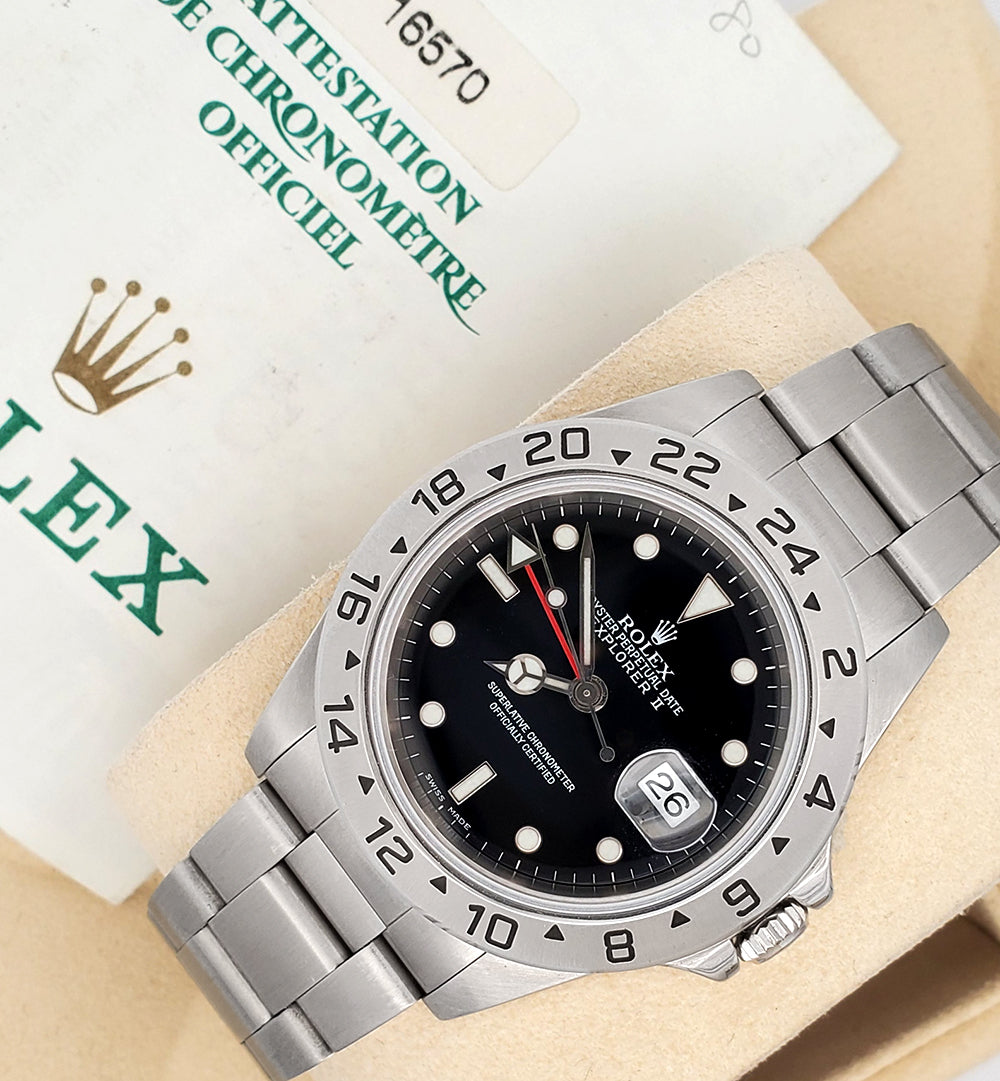The Rolex Explorer II 16570 is a rugged yet refined 40mm steel watch, featuring a bold black dial and Oyster bracelet. Ideal for adventurers, it comes complete with box and papers!