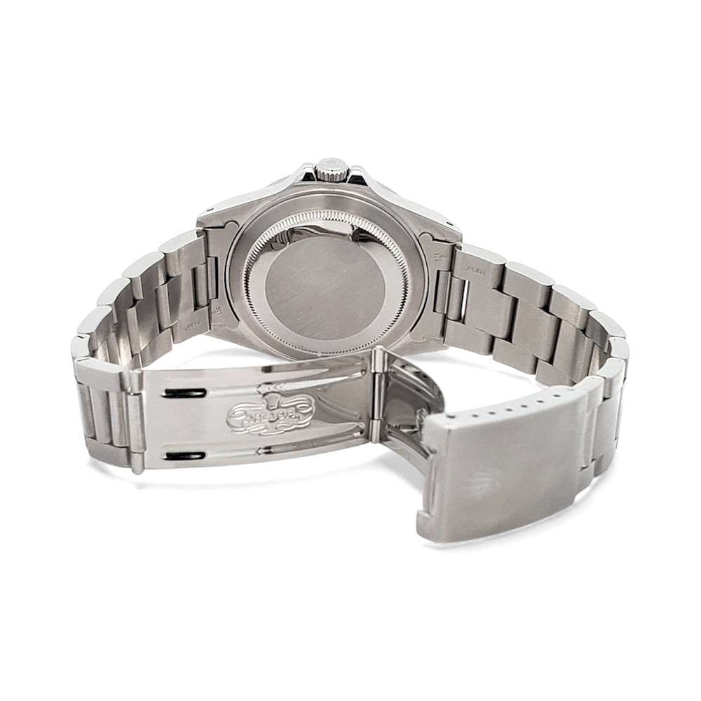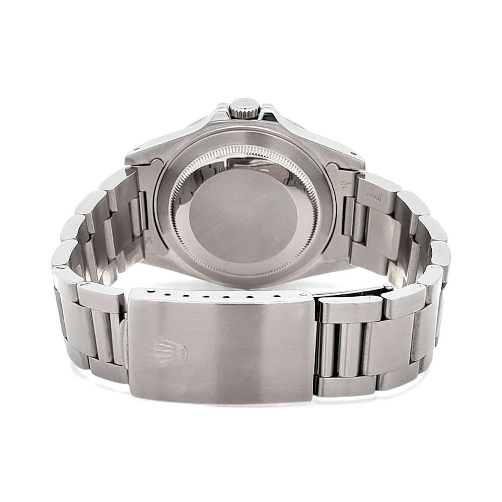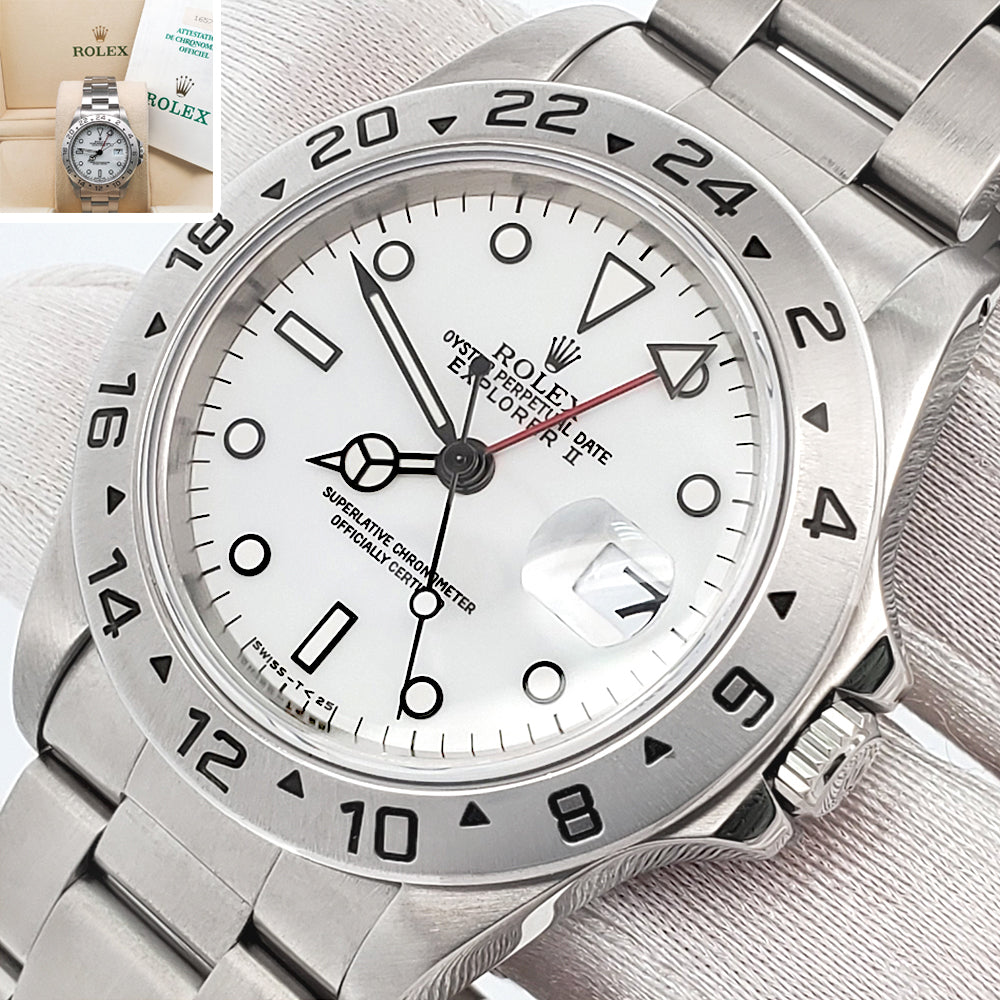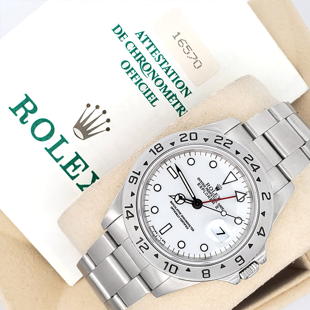 This Rolex Explorer II 40 mm ref. 16570 features a Polar white dial, steel Oyster case, red GMT hand—adventure-ready classic.