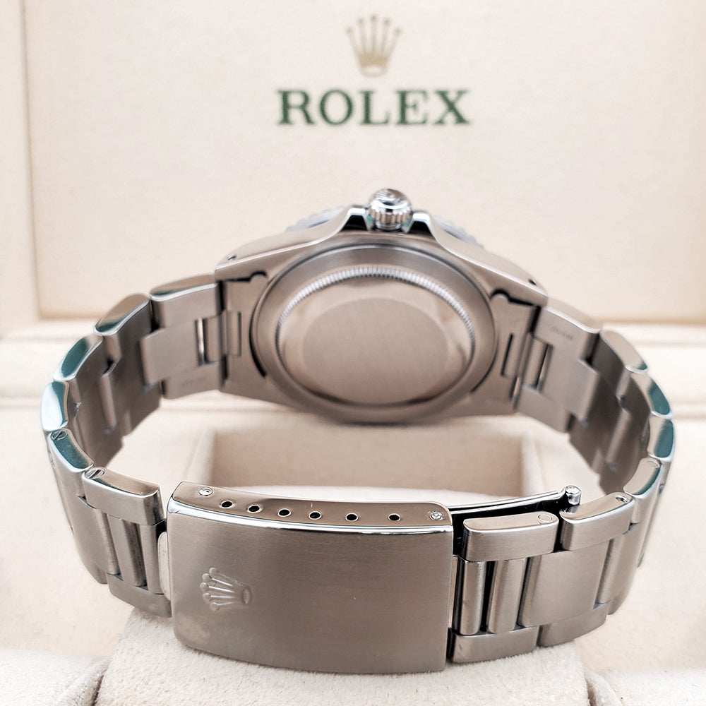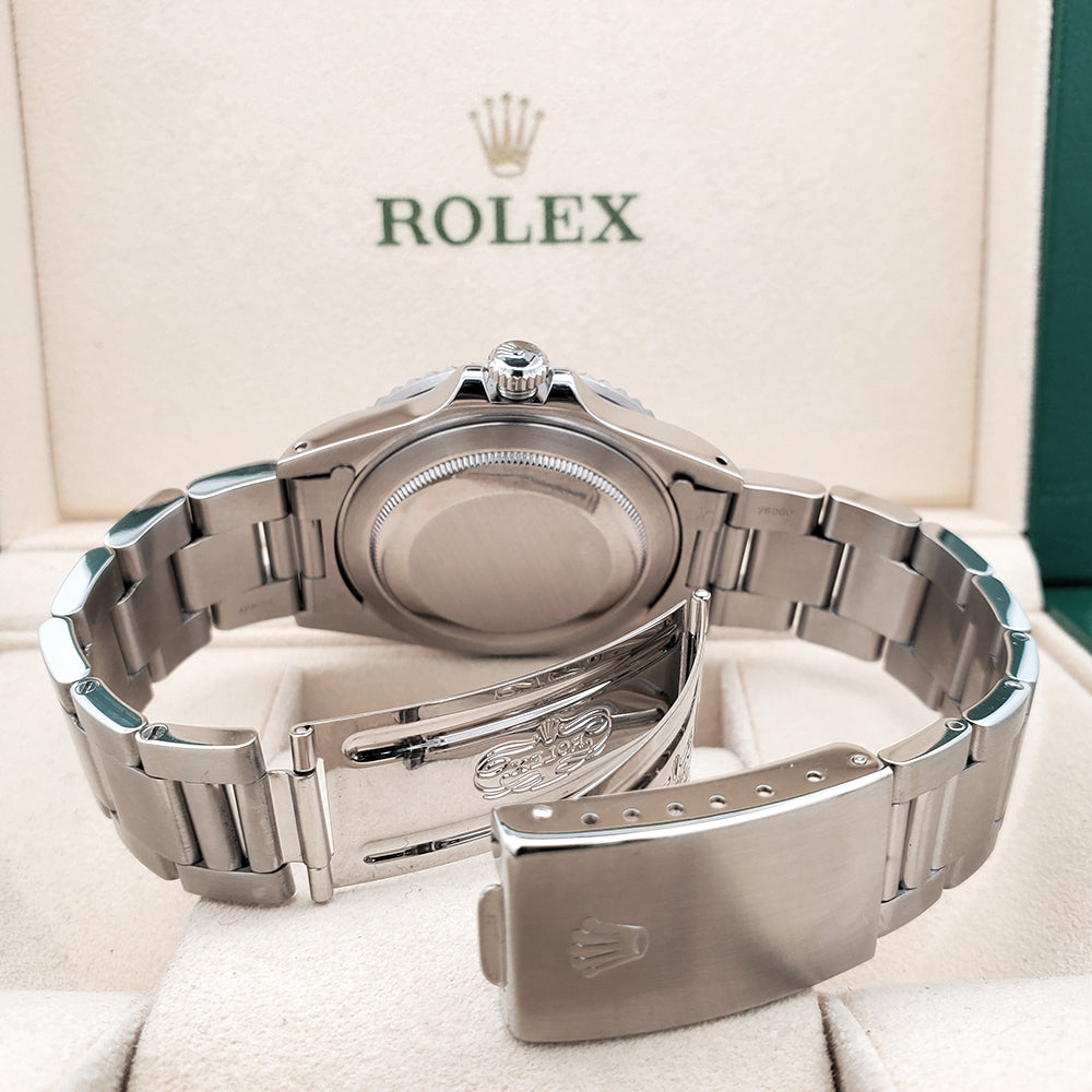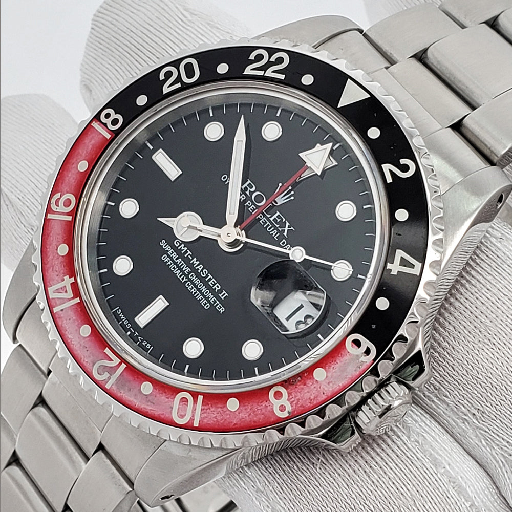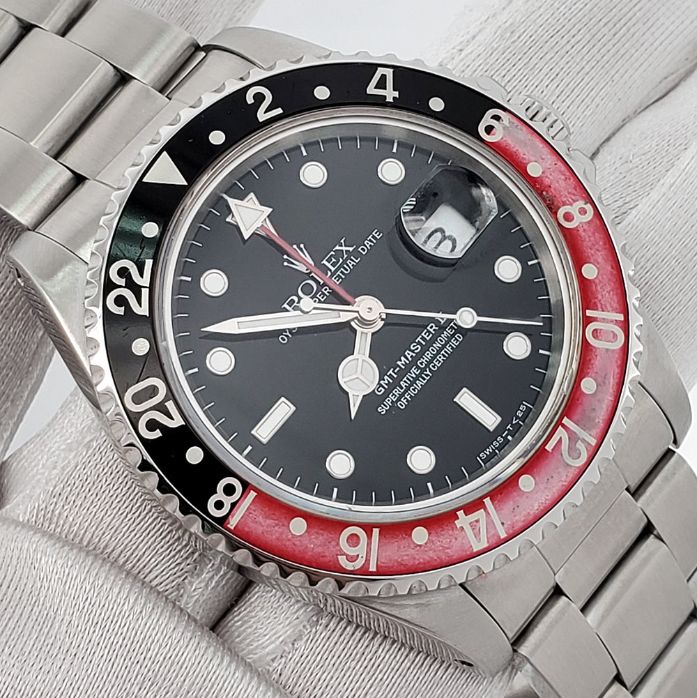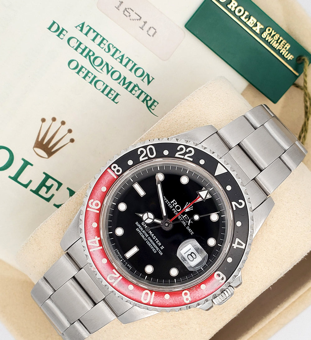 The Rolex GMT-Master II 16710 with a 40mm case features the iconic "Coke" bezel (black and red). It's known for its dual time zone function and comes with box and papers.