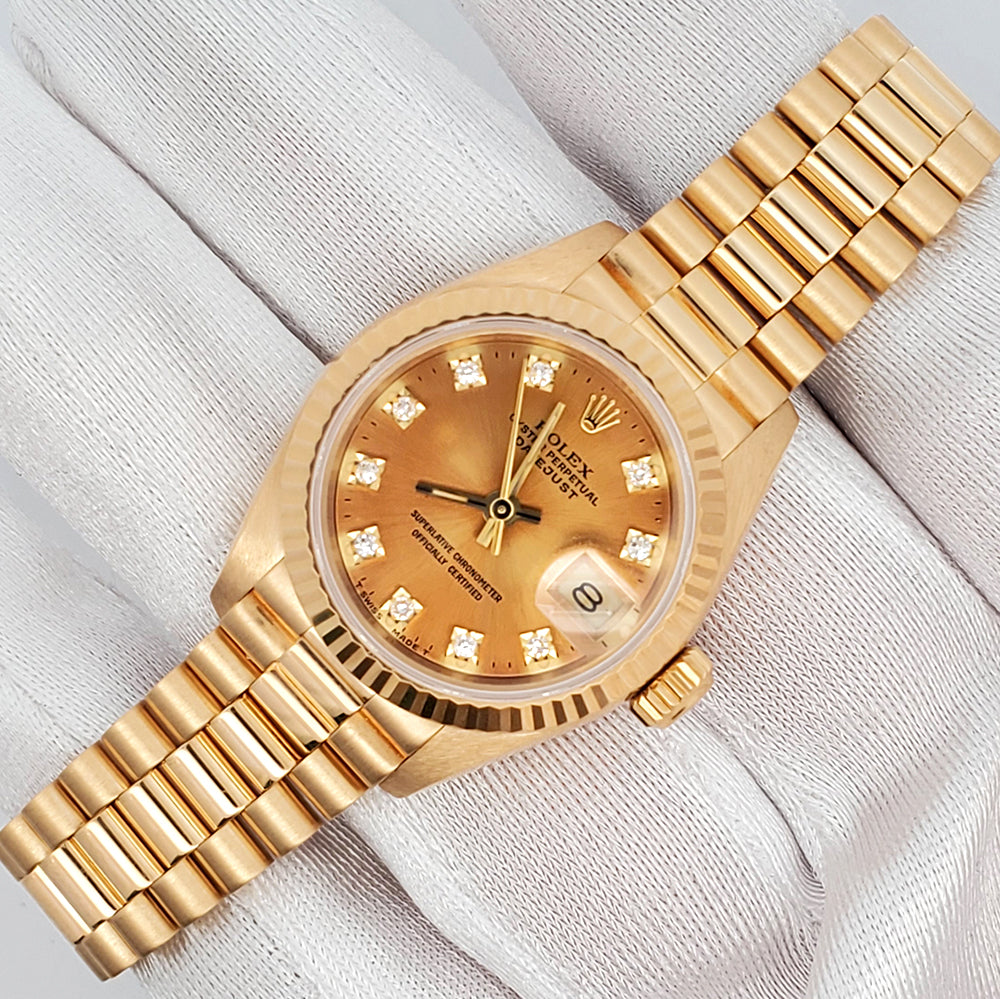 Rolex President Datejust 26mm Factory Champagne Diamond Dial Yellow Gold Watch 69178