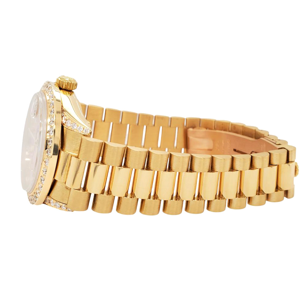 Rolex President Datejust 31mm Yellow Gold Watch. Rolex self-winding automatic movement. Custom 2.3ct diamond bezel/Lugs/diamond numerals dial (diamonds are not set by Rolex).