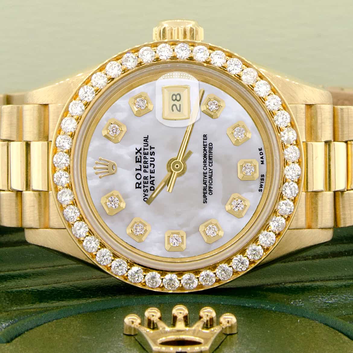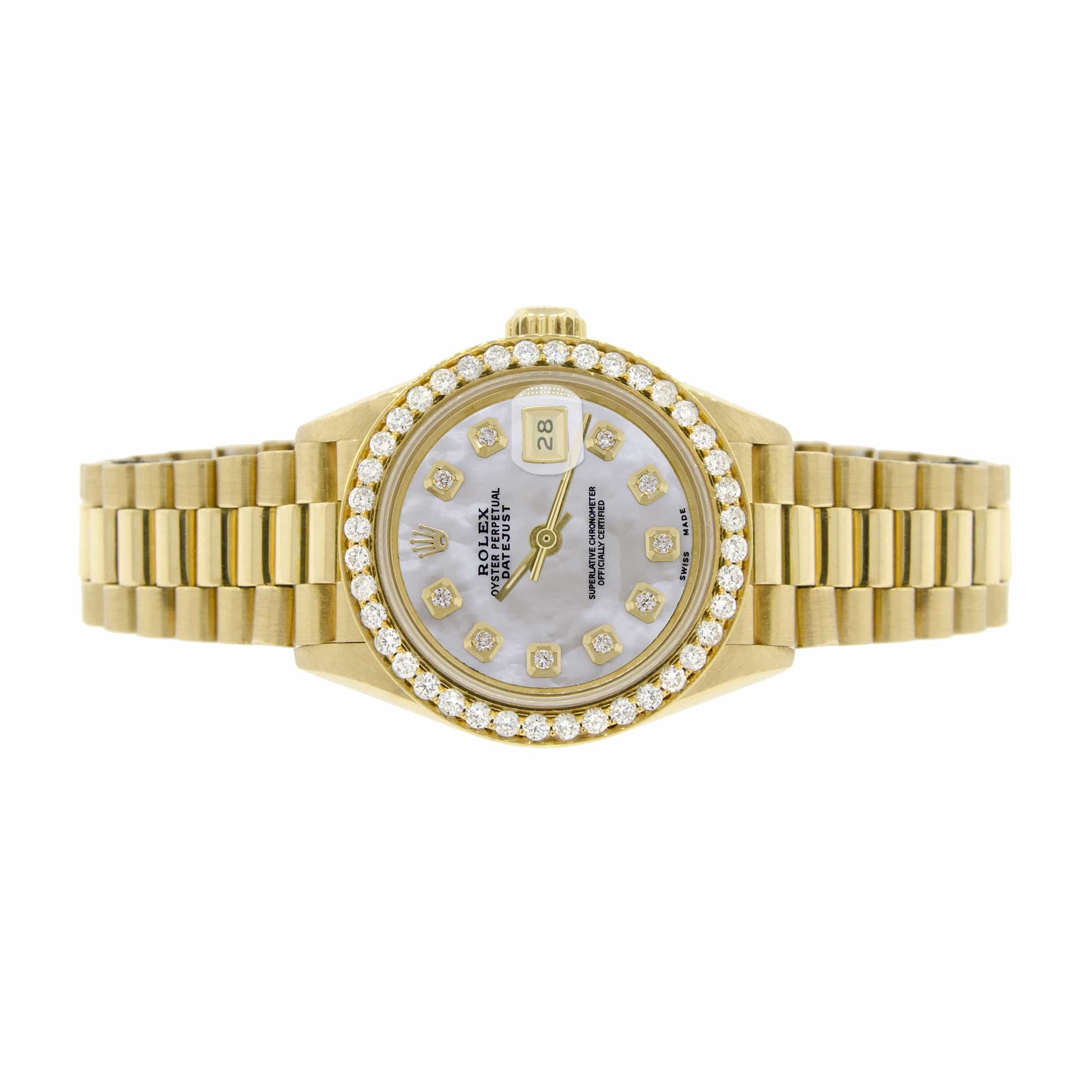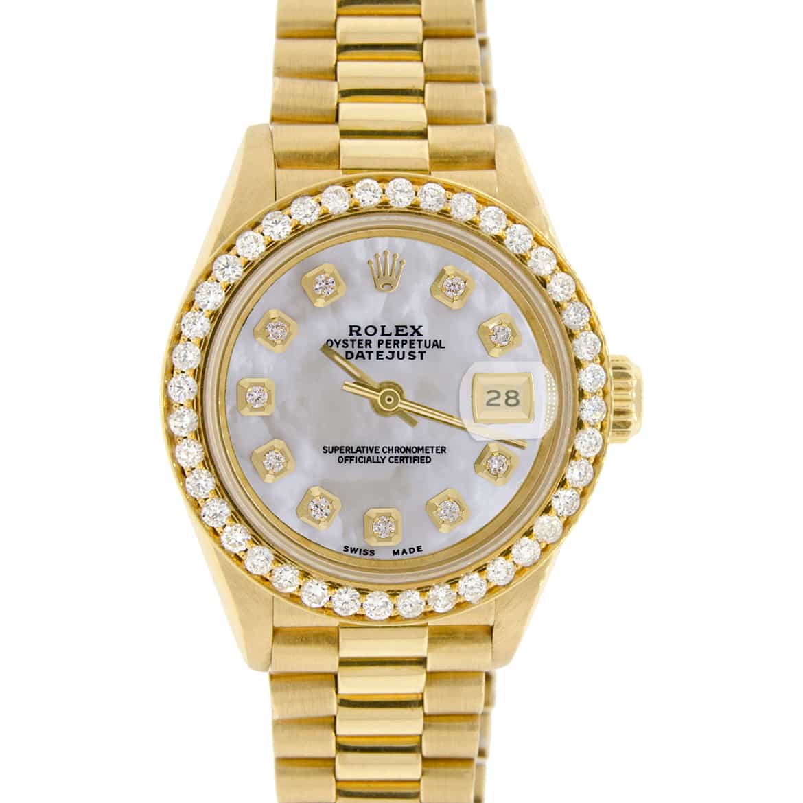 Rolex President Datejust 18K Yellow Gold Automatic Ladies Watch. Self-winding Rolex automatic movement. 18K Yellow Gold case 26mm in diameter featuring custom diamond bezel and white Mother of Pearl dial with diamond hour markers. Screw-down crown. Equipped with scratch-resistant sapphire crystal. Date calendar window at 3 o'clock position. Functions: hours, minutes, seconds, and date. Rolex 18K yellow gold President bracelet.