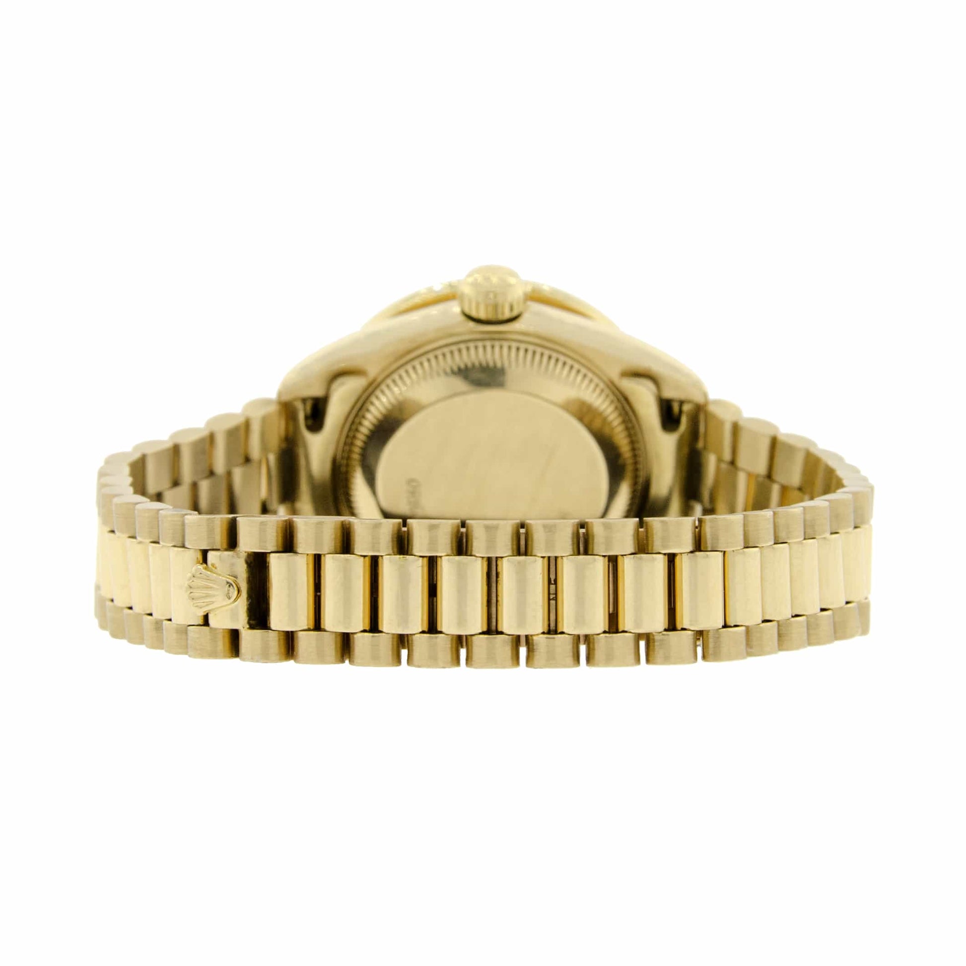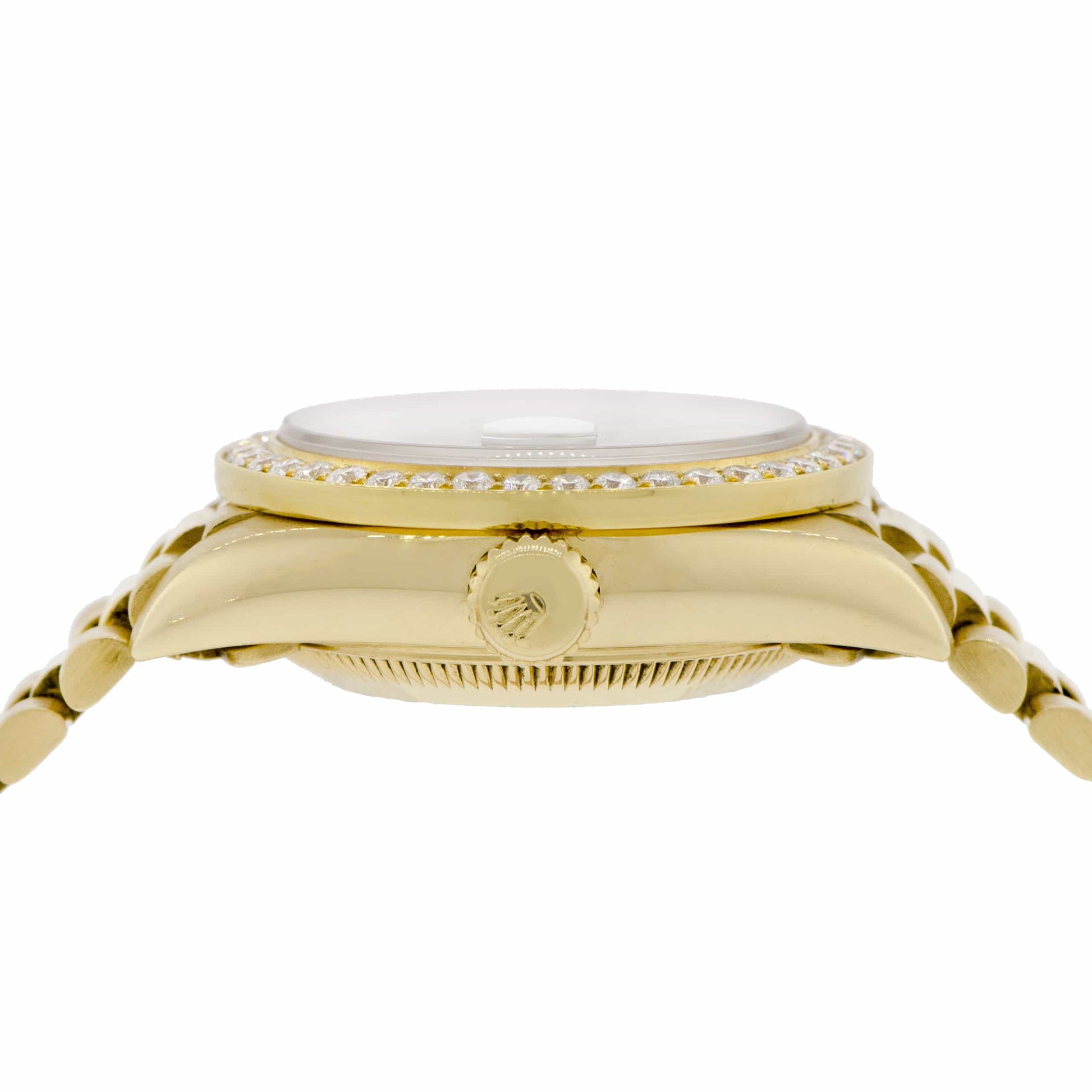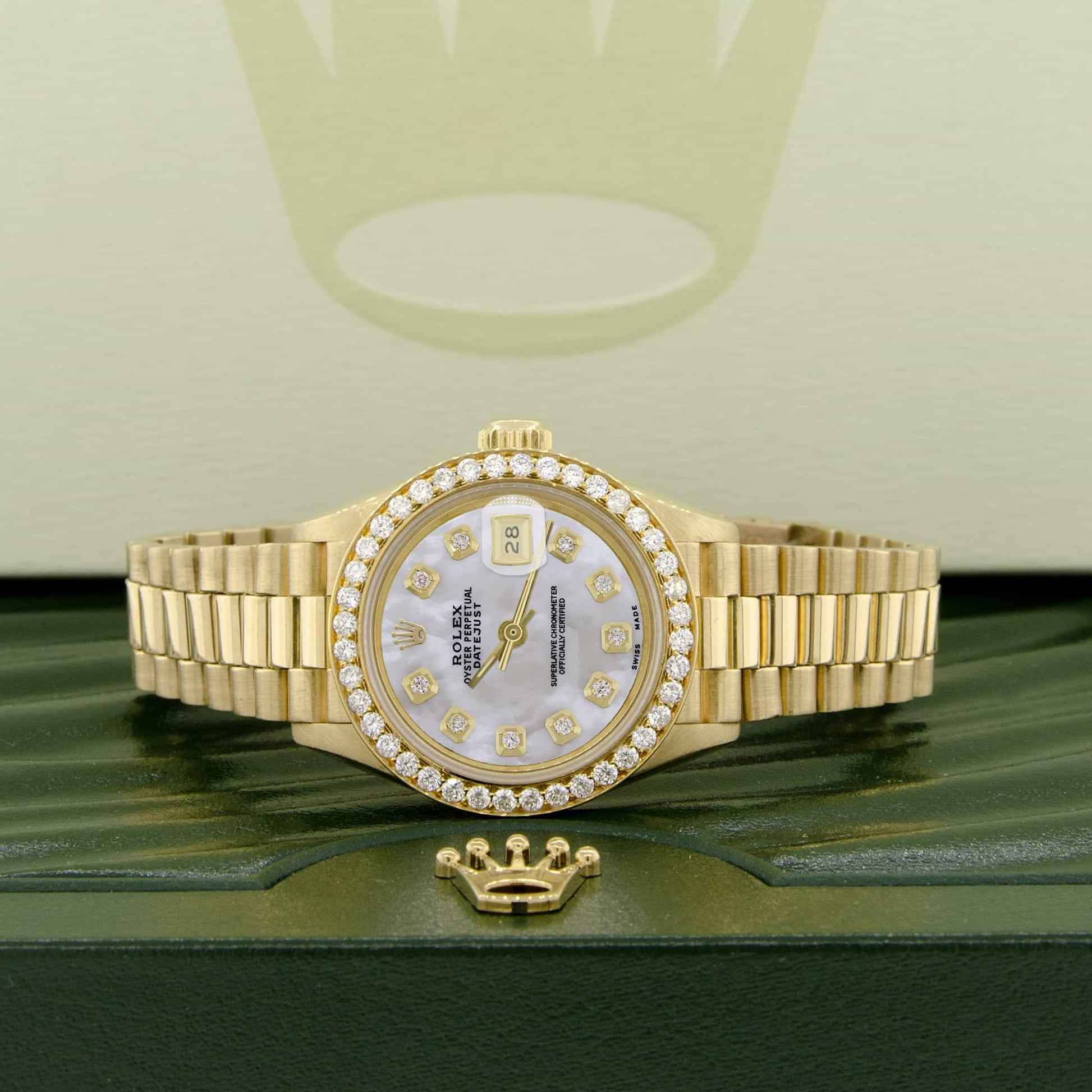 Rolex President Datejust 18K Yellow Gold Automatic Ladies Watch. Self-winding Rolex automatic movement. 18K Yellow Gold case 26mm in diameter featuring custom diamond bezel and white Mother of Pearl dial with diamond hour markers. Screw-down crown. Equipped with scratch-resistant sapphire crystal. Date calendar window at 3 o'clock position. Functions: hours, minutes, seconds, and date. Rolex 18K yellow gold President bracelet.