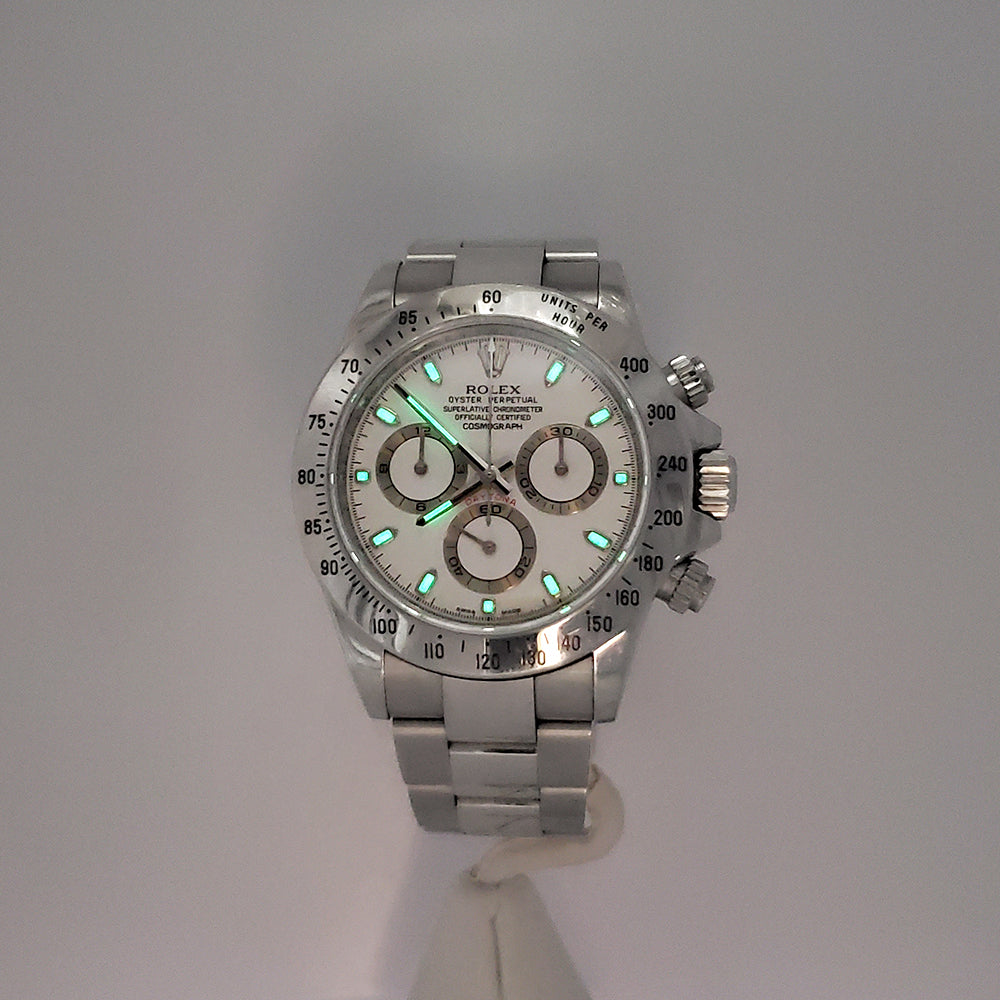 Rare collector’s piece Unpolished Rolex Cosmograph Daytona 40mm 116520 “APH” with white dial in stainless steel. Complete with box, papers, and tag.