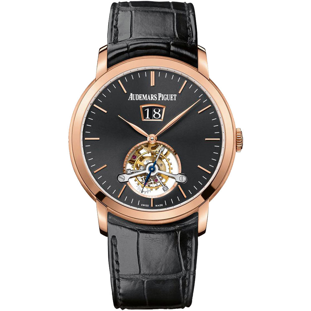The Audemars Piguet Jules Audemars 26559OR.OO.D002CR.01 is a distinguished example of fine watchmaking, powered by a precision-engineered tourbillon movement designed to counteract the effects of gravity for superior timekeeping accuracy. Encased in a luxurious 41mm 18K rose gold case with a matching polished bezel, the watch exudes timeless elegance. Its sophisticated black dial is adorned with refined rose gold hour markers, while a discreet date window at 12 o’clock adds practical functionality. Protected by a scratch-resistant sapphire crystal, this masterpiece is completed by a black alligator leather strap that enhances its classic, formal appeal—making it a perfect choice for discerning collectors.
