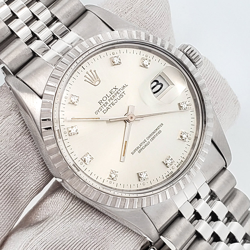 Vintage Rolex Datejust Factory Silver Diamond Dial 36mm Steel Jubilee Watch 16030